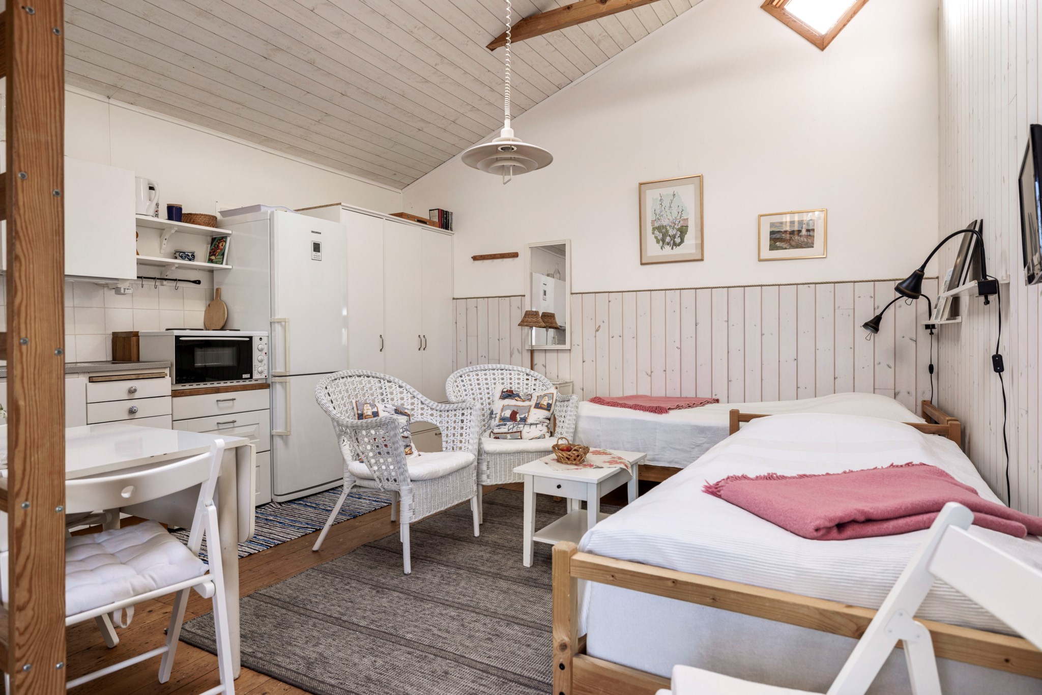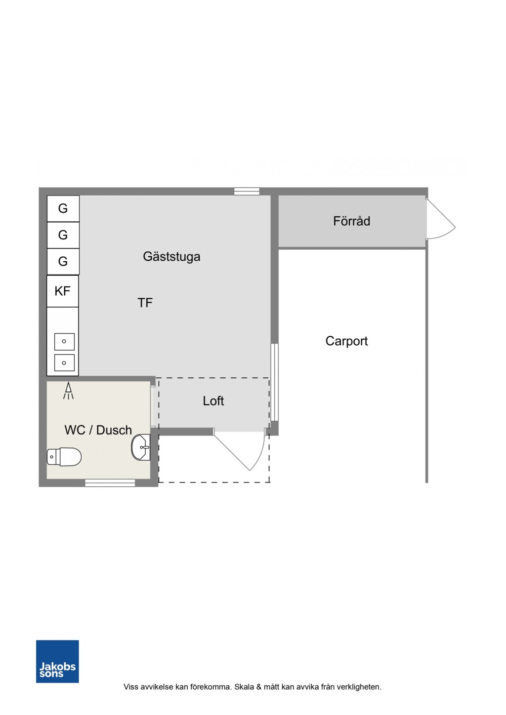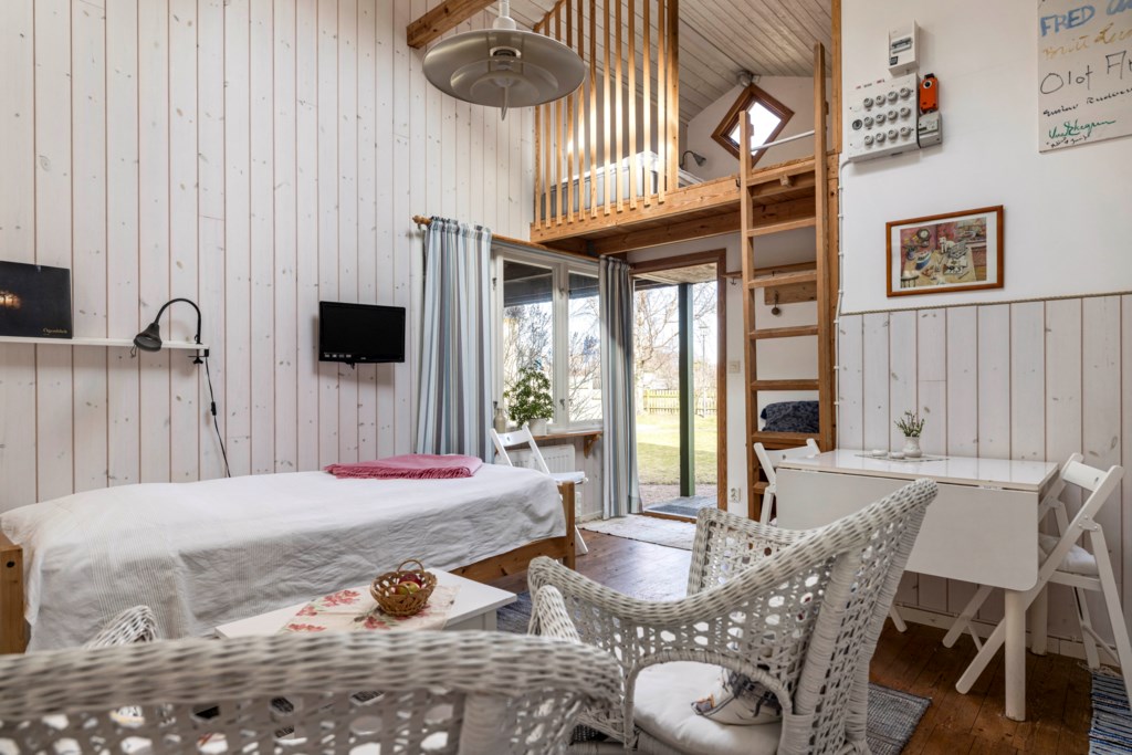 Gäststuga om ca 23 kvm med ett sällskapsrum med litet pentry och plats för både sängar och matbord, sovloft och ett badrum med dusch.TV- och internetanslutning