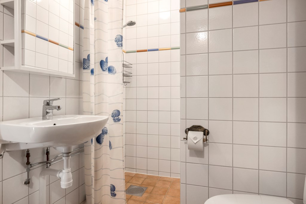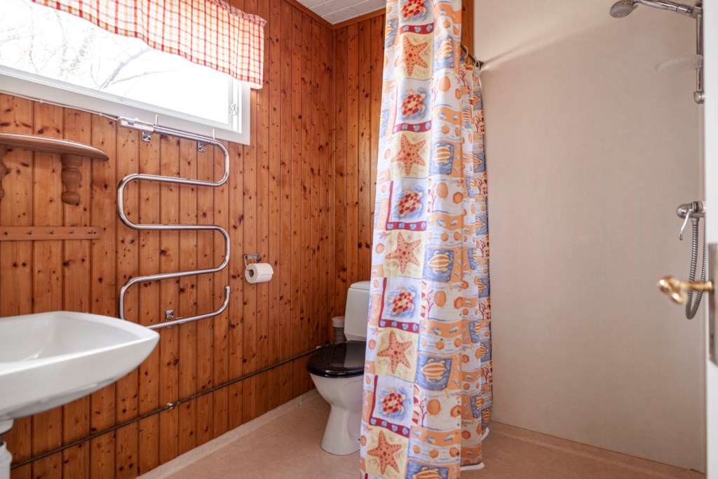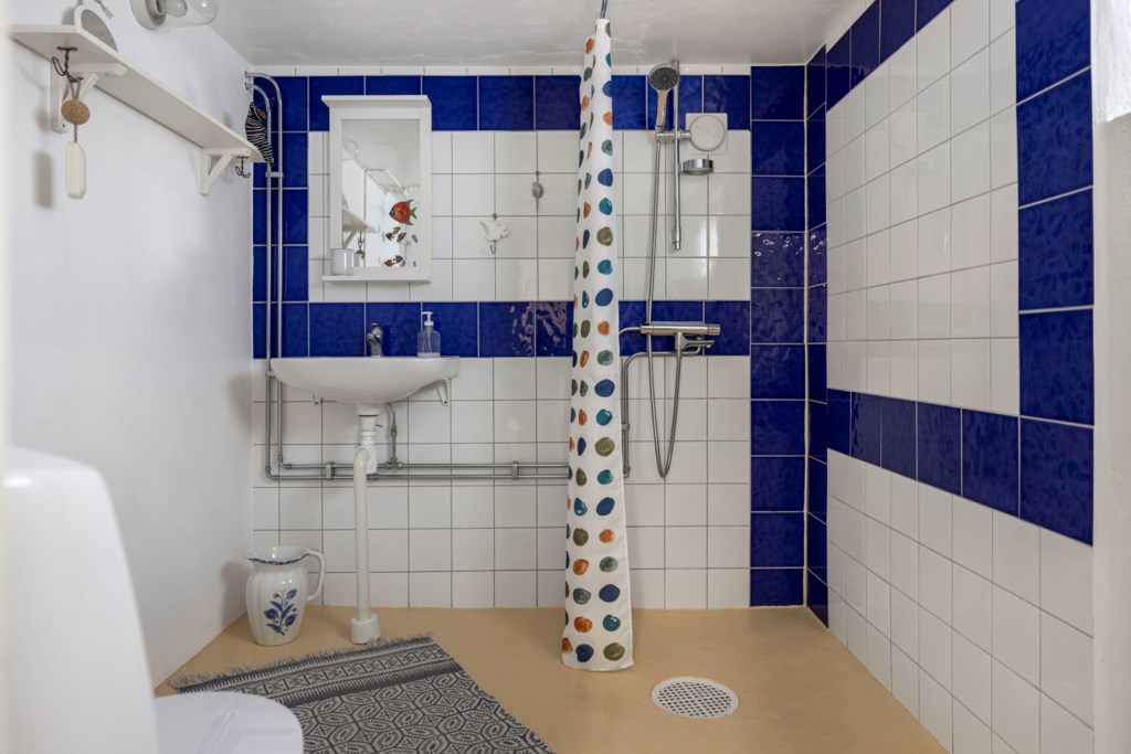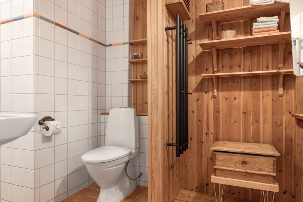 Golv: Klinker. Väggar: Kakel. Toalett, tvättställ, dusch och elektrisk golvvärme.