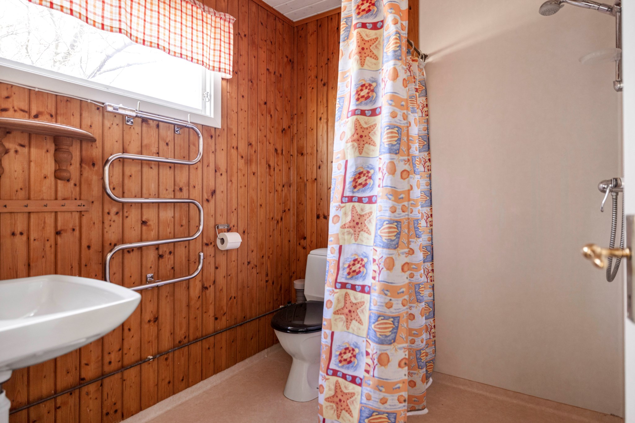 Golv: Våtrumsmatta. Väggar: Delvis kakel. Toalett, tvättställ, dusch och handdukstork.