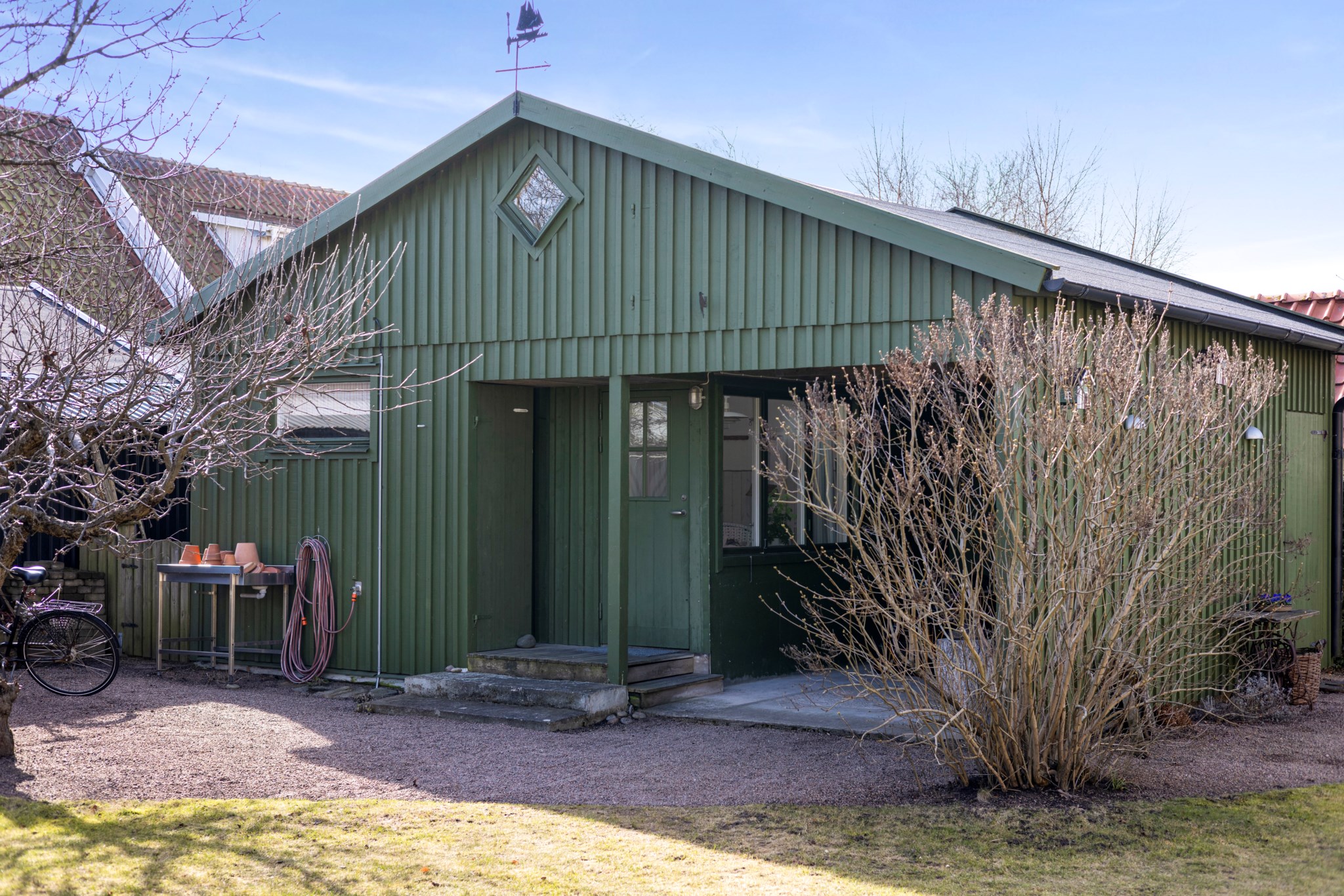 Grusad parkeringplats med elbilsladdare samt carport.Övriga byggnader