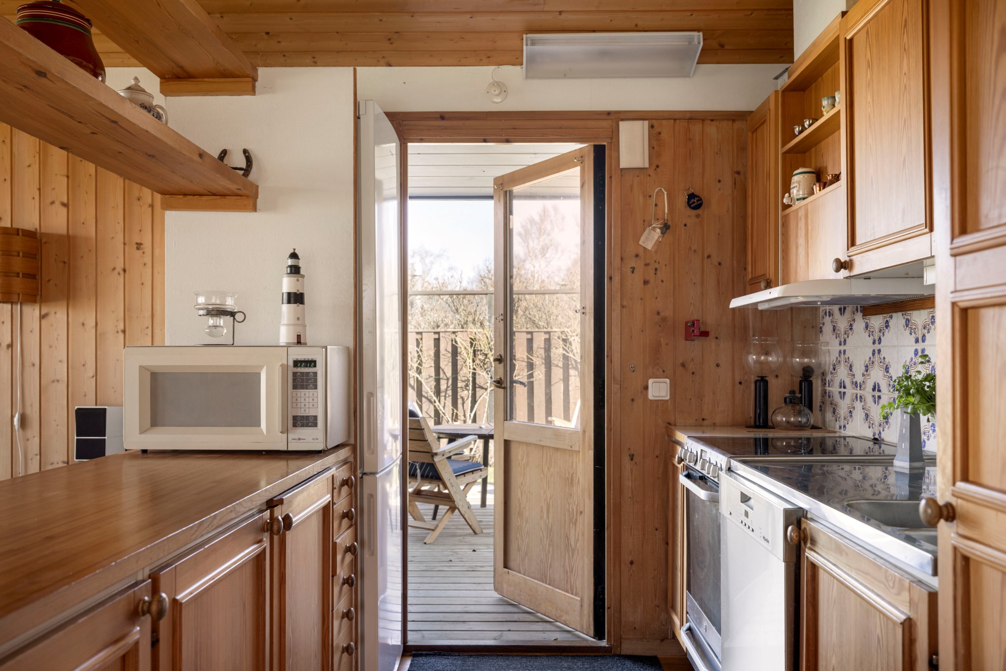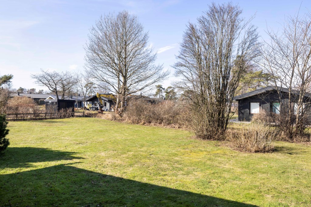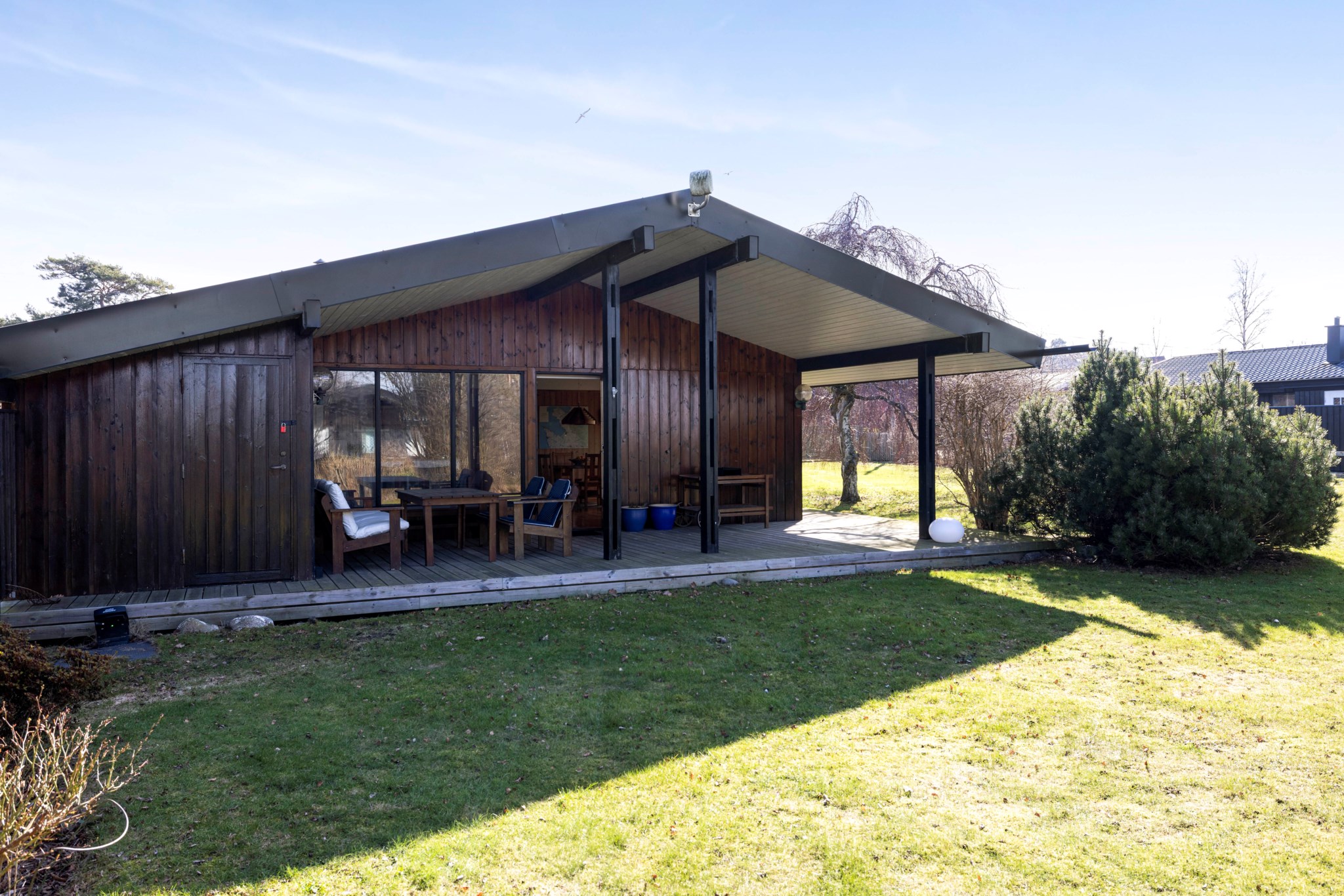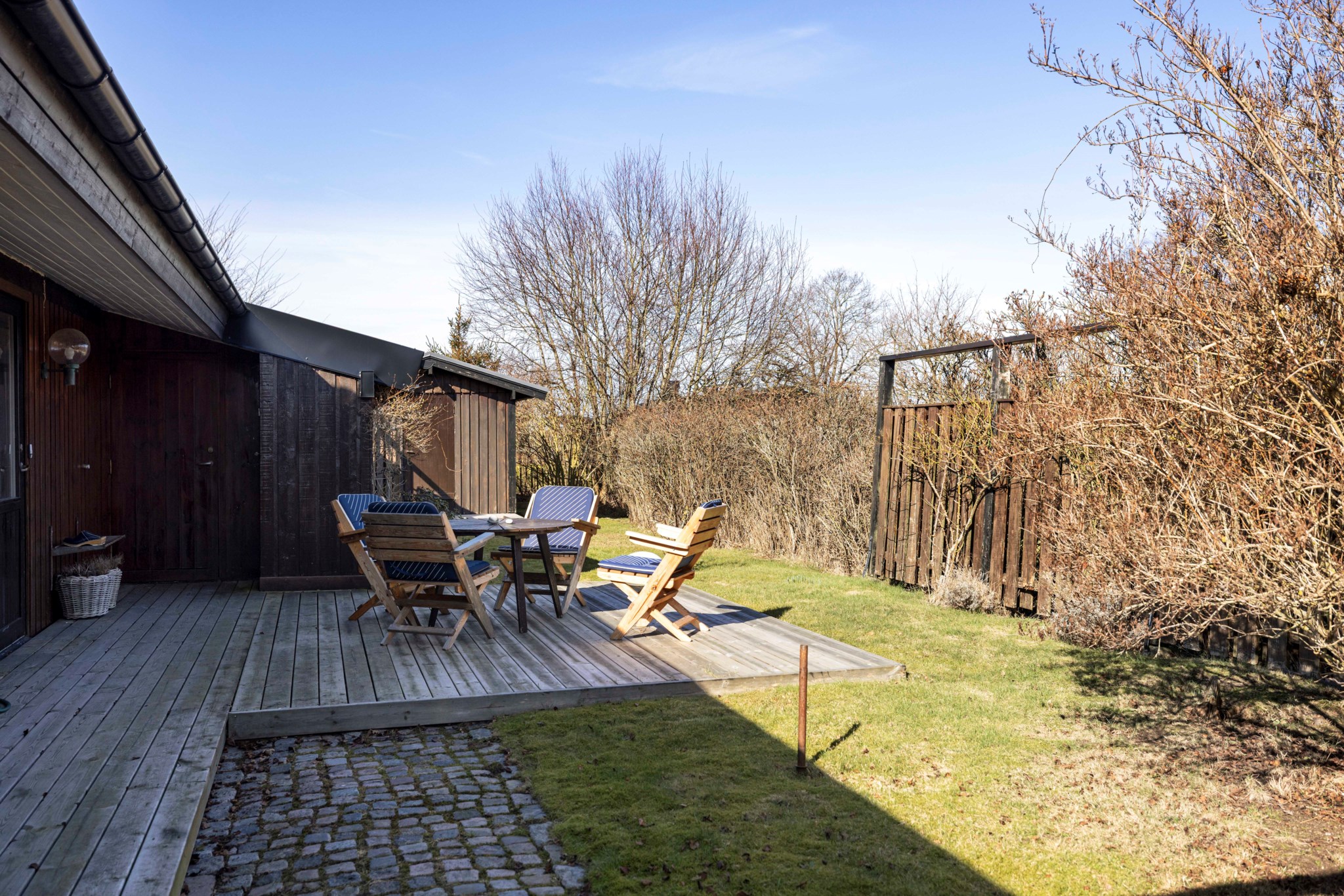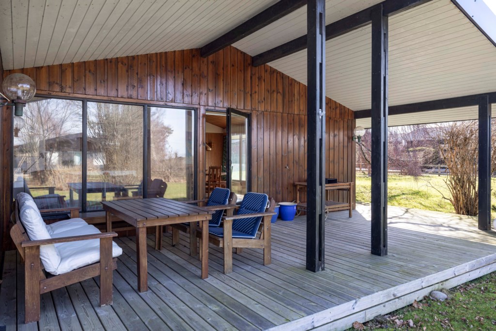 Trätrall som löper runt merparten av bostaden med en överbyggd uteplats med kvällssol i anslutning till allrum samt en frukosthörna i anslutning till kök.Bilplats