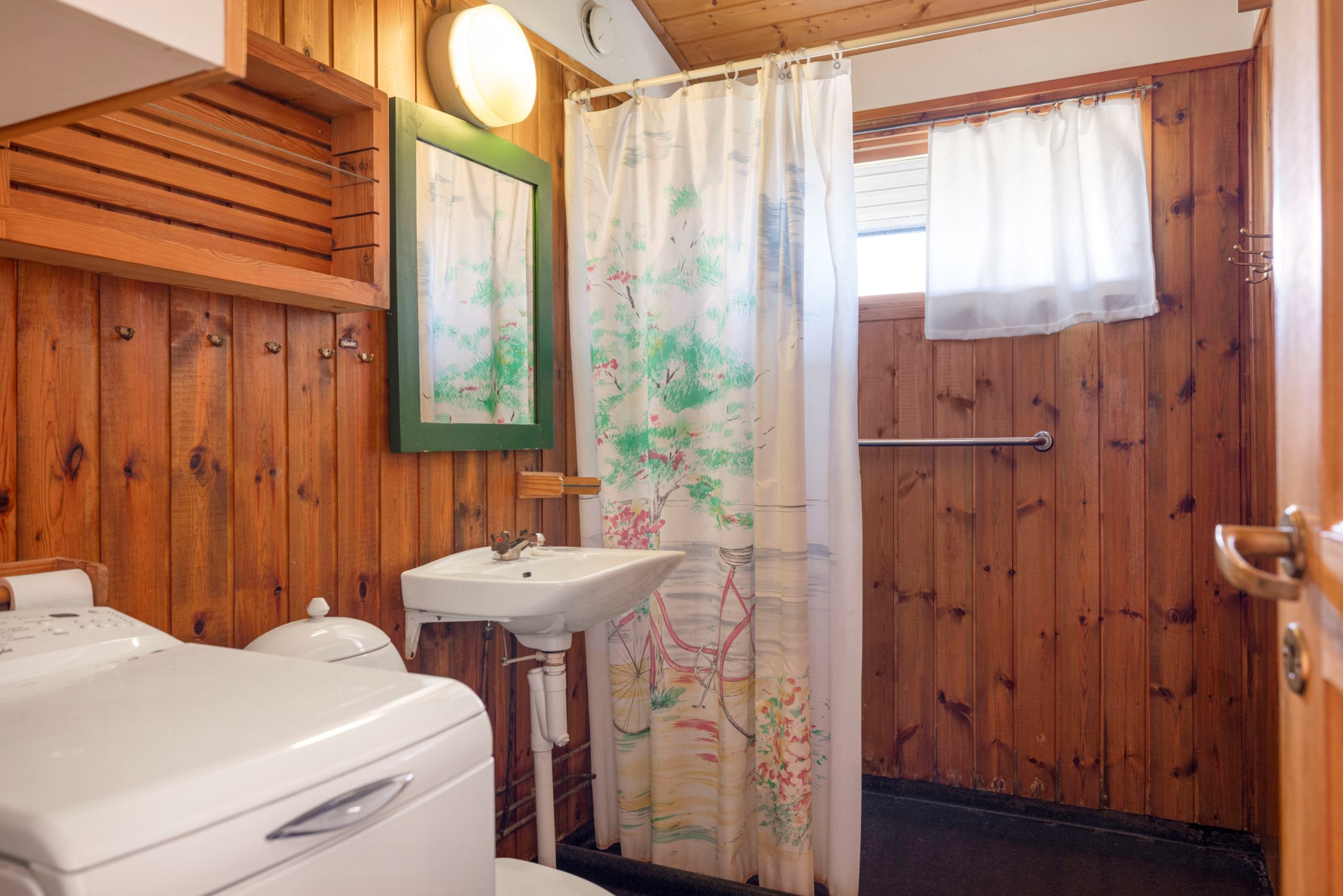Golv: Våtrumsmatta. Väggar: Träpanel. Utrustning: Toalett, tvättställ, dusch och toppmatad tvättmaskin.