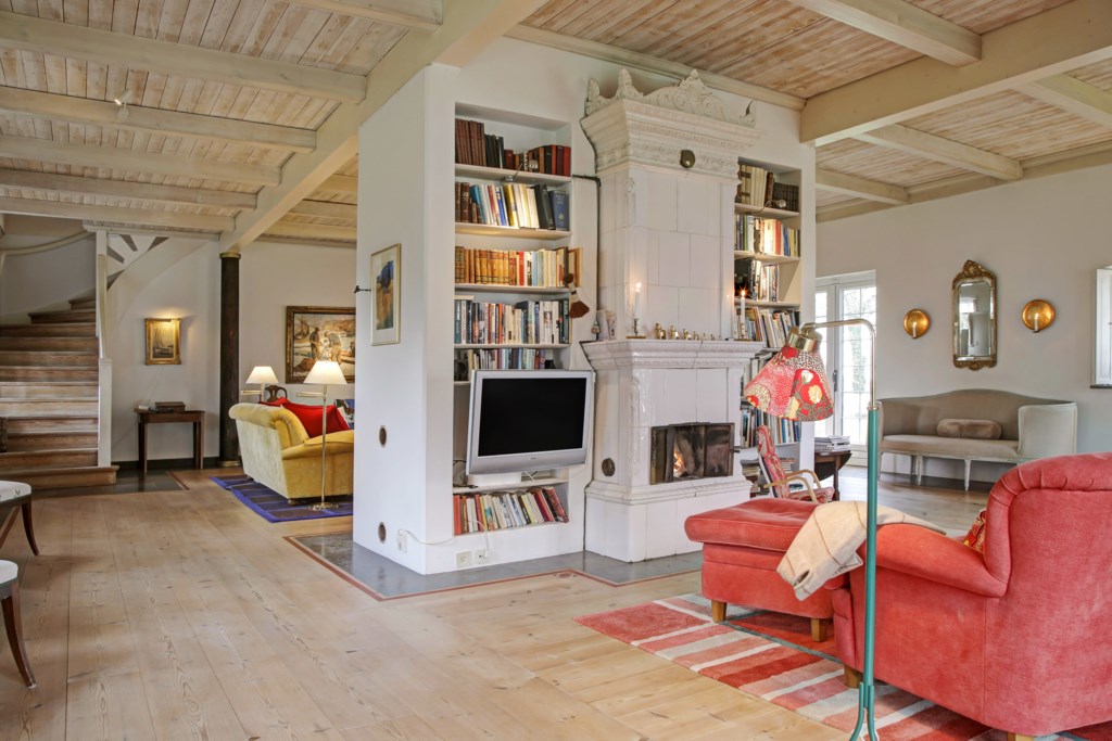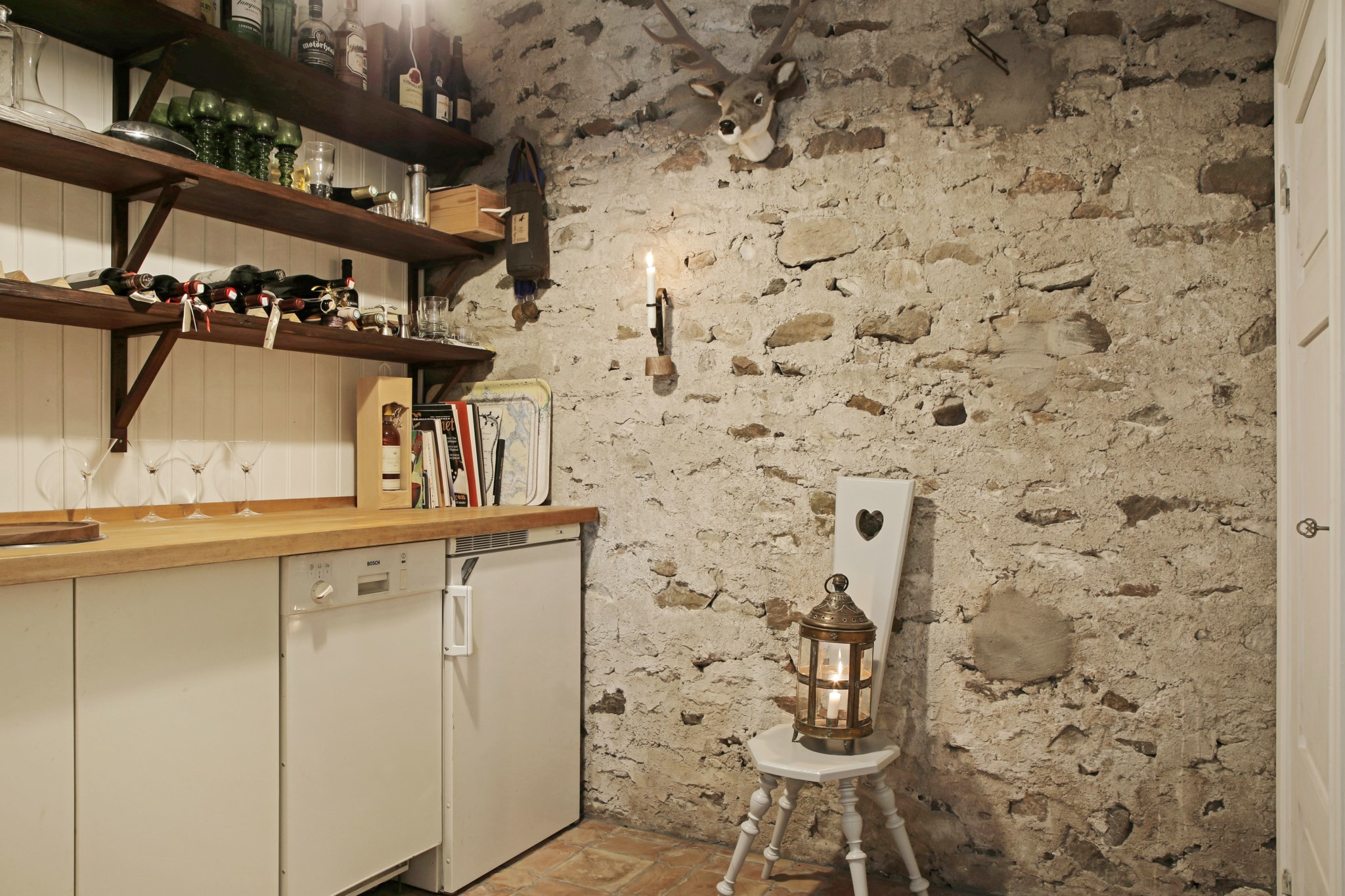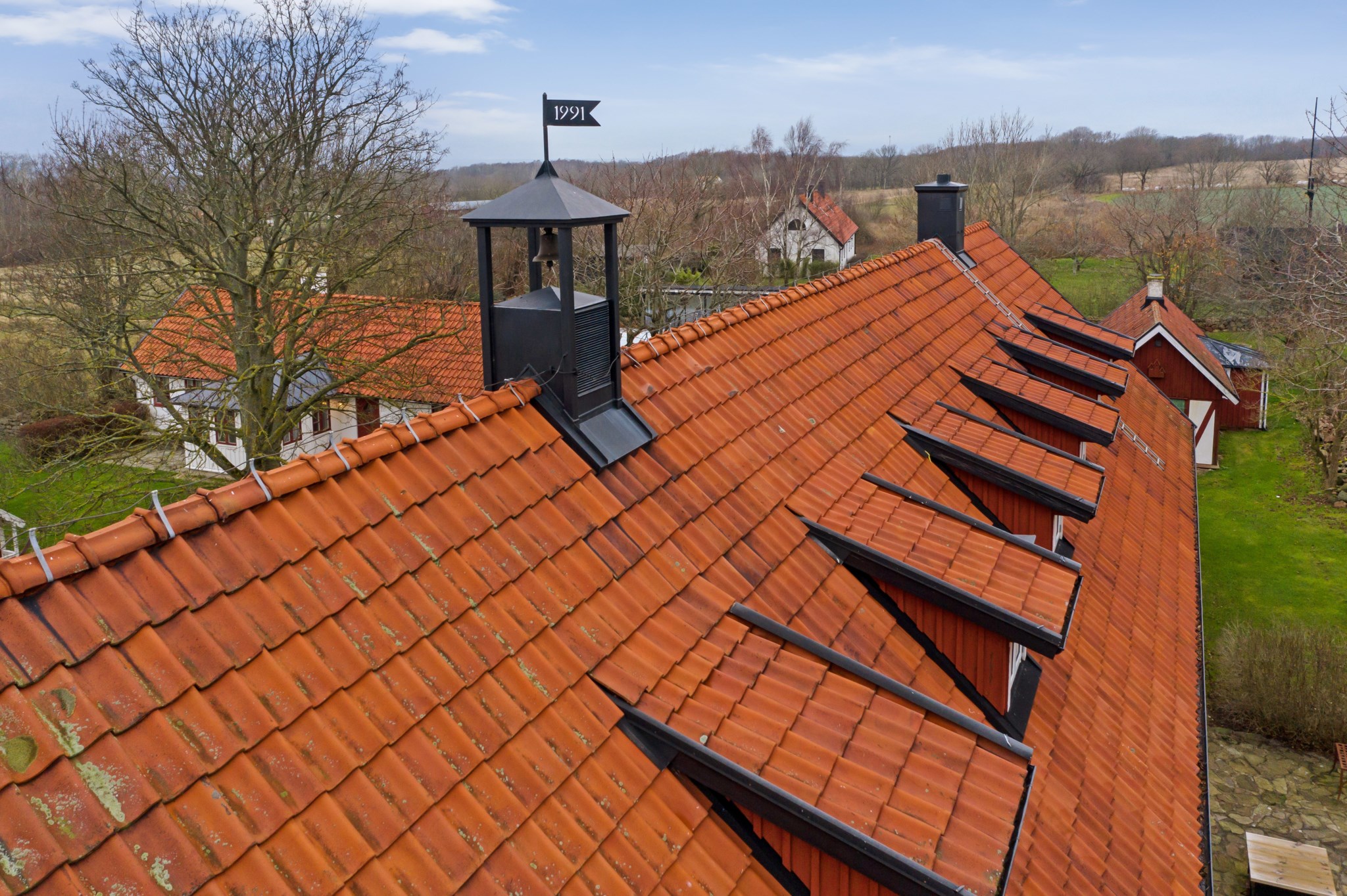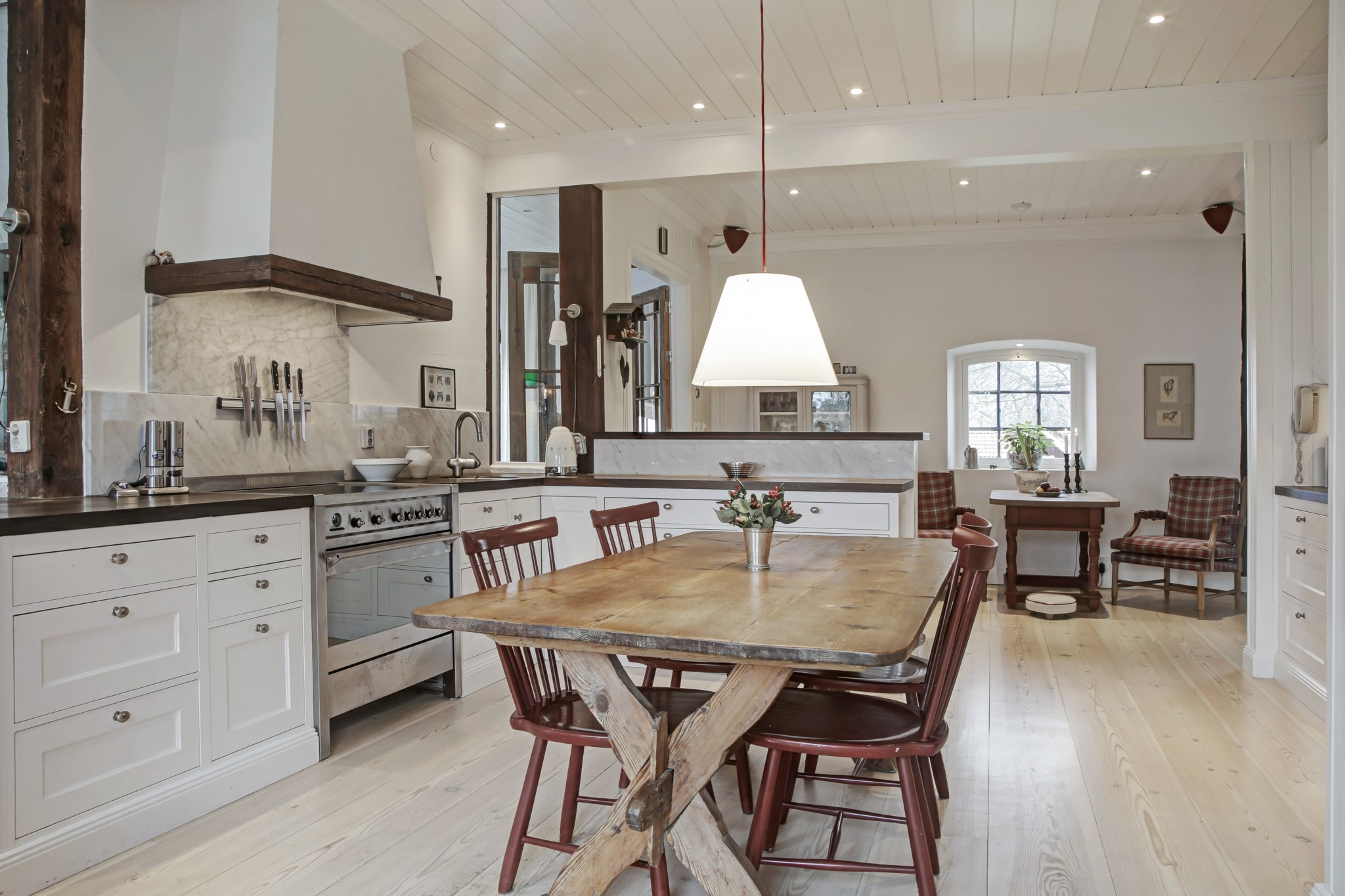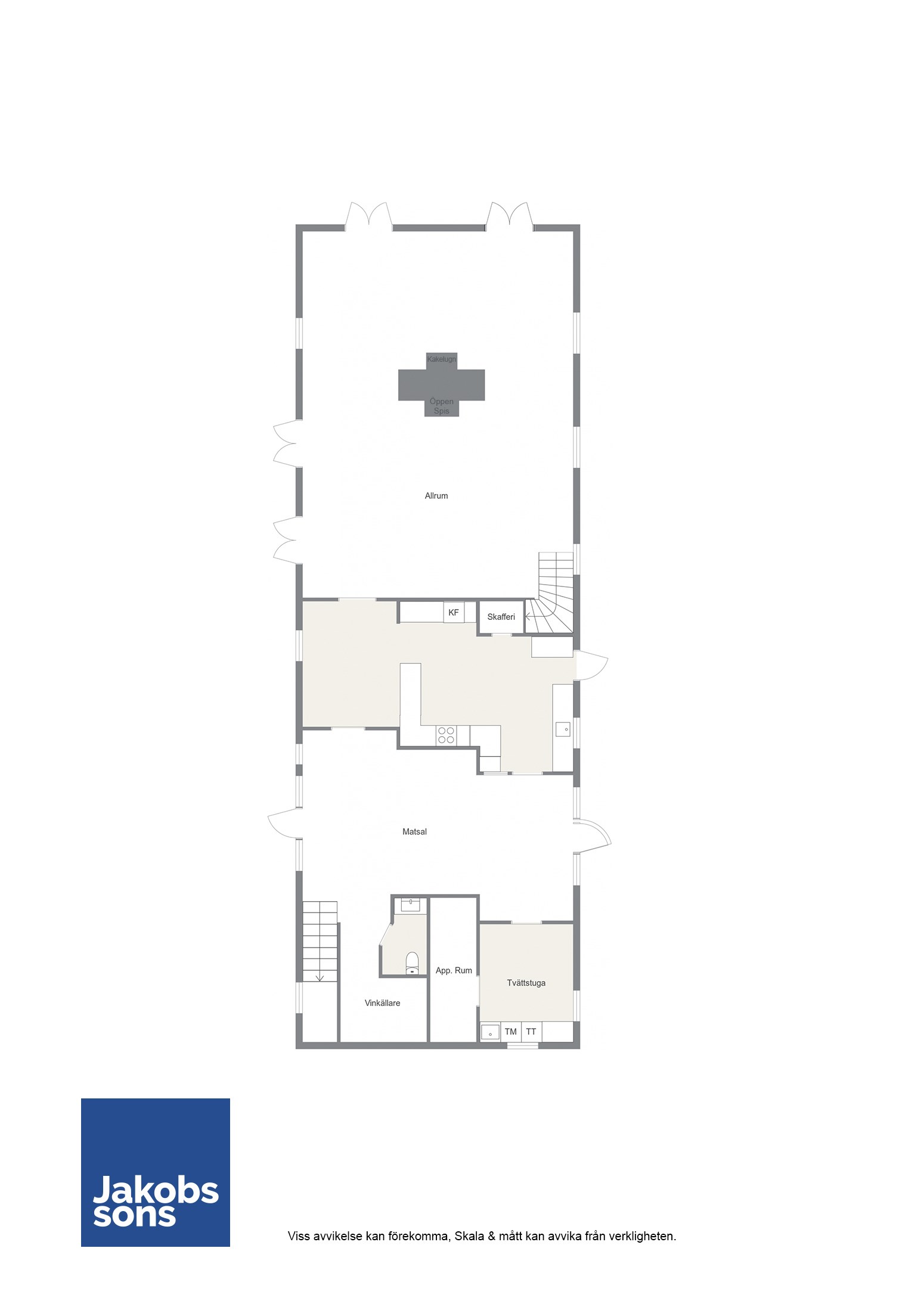 Bostaden är disponerad över två genomtänkta våningsplan och erbjuder en elegant kombination av generösa sällskapsytor, avskilda privata rum och exklusiva bekvämligheter. Planlösningen är utformad för att skapa ett hem som fungerar lika väl för representativa tillställningar som för det bekväma vardagslivet. Entréplanet välkomnar med ett storslaget allrum där rymd och ljus samspelar i en inbjudande atmosfär tillsammans med dubbla eldstäder. Här finns gott om plats för flera möbleringsgrupper och sociala sammanhang. I öppen och naturlig anslutning ligger det påkostade köket, utformat med köksö som hemmets självklara nav. Köket erbjuder generösa arbetsytor, god förvaring och en genomtänkt planering som bjuder in till både matlagning och umgänge. I anslutning finns ett praktiskt skafferi som förstärker kökets funktionalitet. Vidare nås en den vackra matsalen i det före detta vagnslidret med utrymme för större middagsbjudningar i en avskild och elegant miljö. Planet kompletteras av en tvättstuga utrustad med tvättmaskin och torktumlare. Här finns även ett separat apparatrum, en gästtoalett samt ett vinrum som bidrar till bostadens genomgående karaktär.