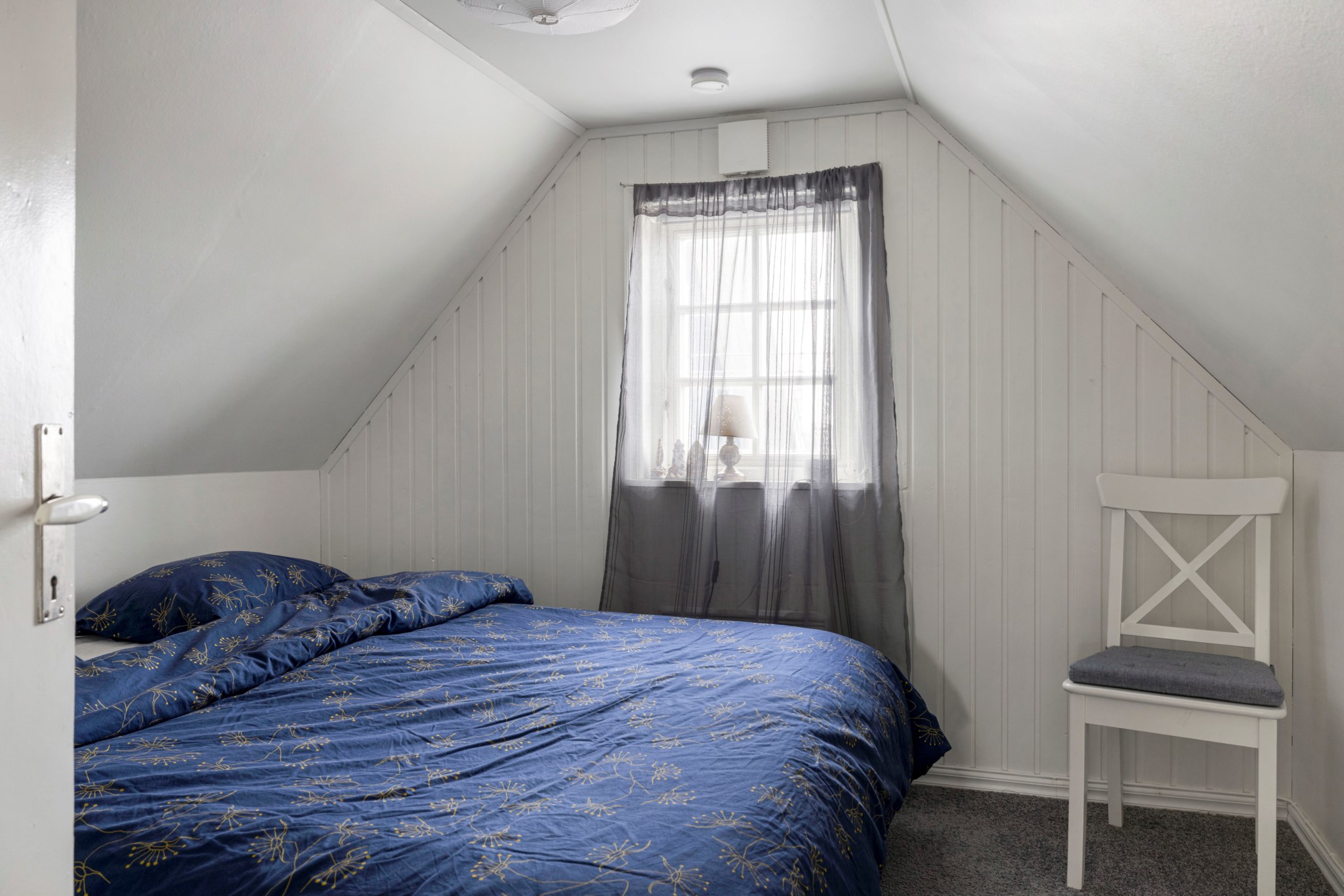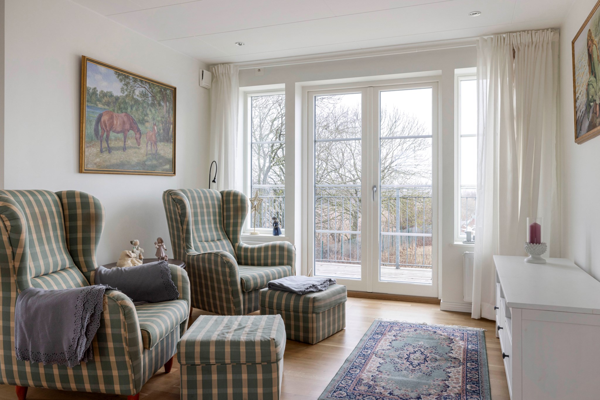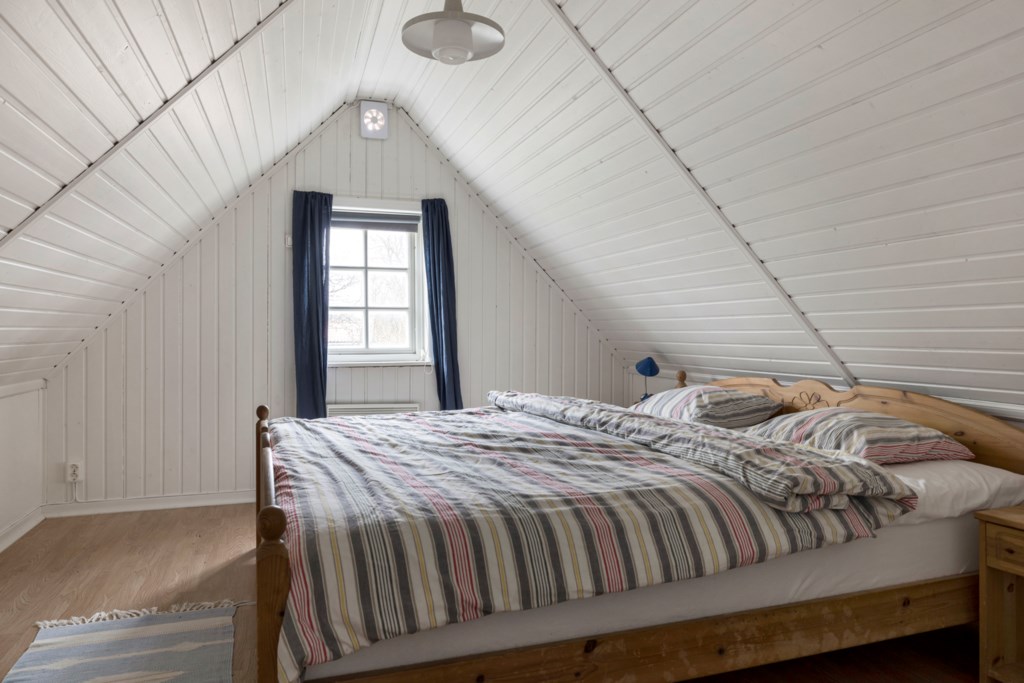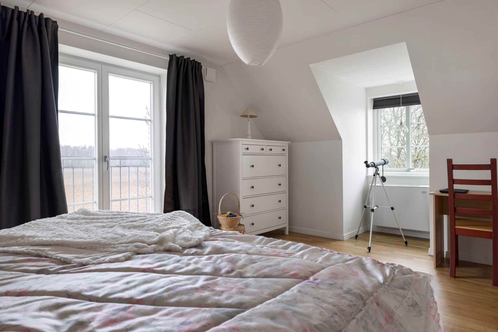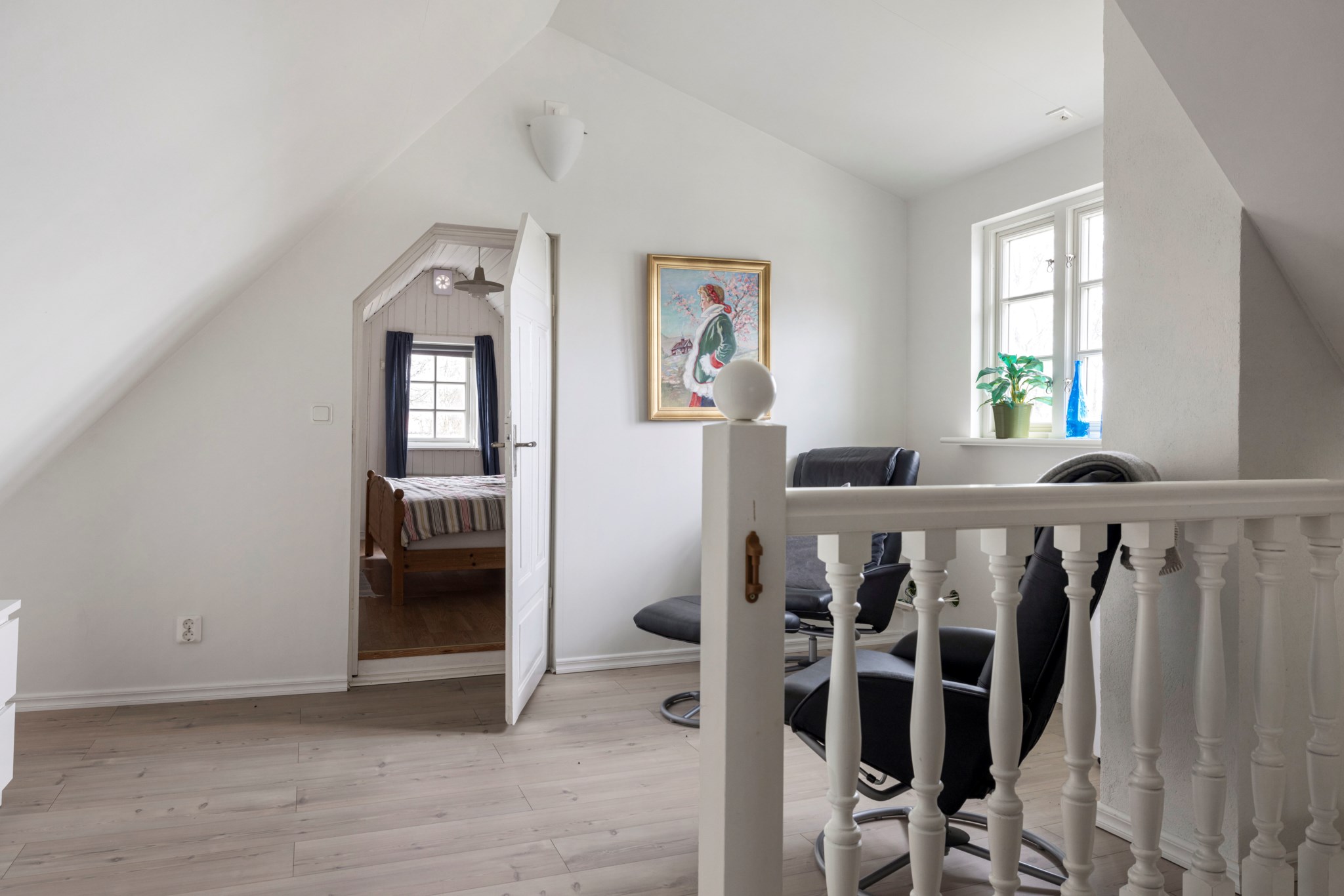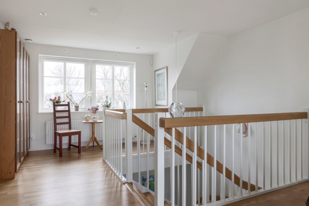 Ovanvåningen nås via entrén och bjuder på ytterligare sociala och privata ytor. Ett mysigt allrum med utgång till balkong ger en fantastisk utblick ner över Torekov och havet. Här njuter du av sommarens vackra solnedgångar i en rogivande miljö. På ena gaveln finns ett stort sovrum med fransk balkong. I den andra delen av våningsplanet ligger ytterligare ett sovrum samt ett badrum med badkar. Båda dessa rum har utgång till en härlig terrass med vidsträckt vy över havet – en privat oas där du kan starta dagen med havsbris och avsluta den under kvällshimlens skiftande färger.