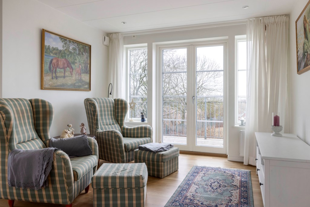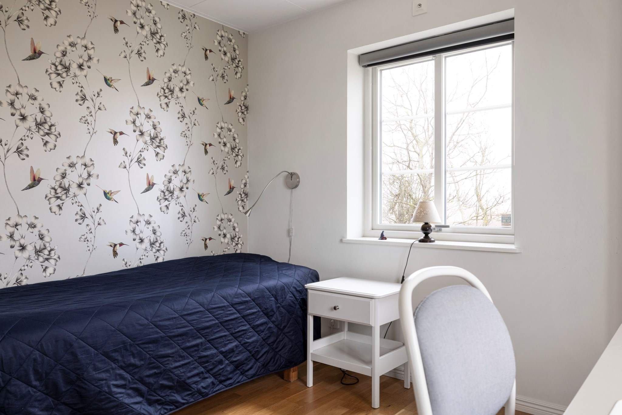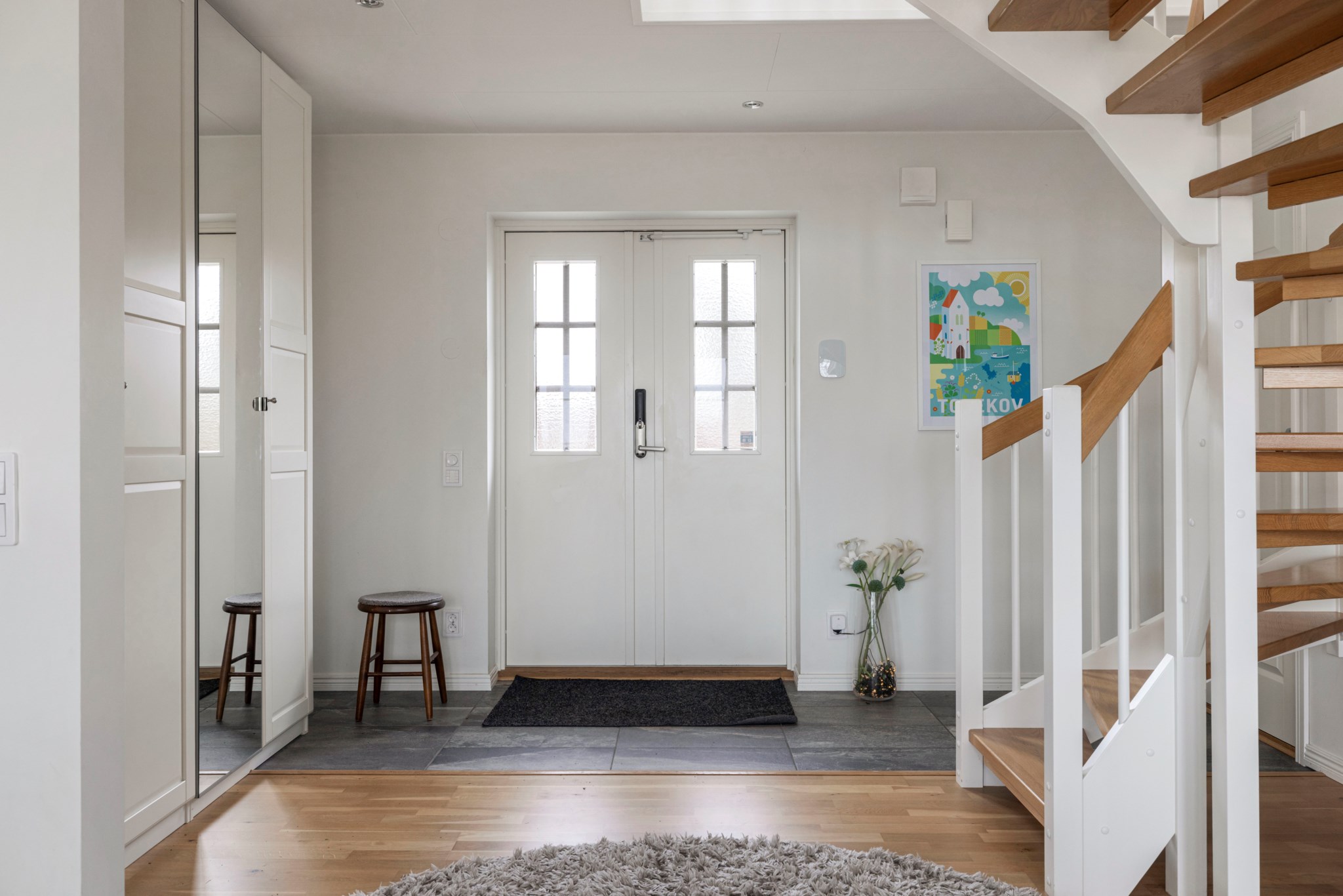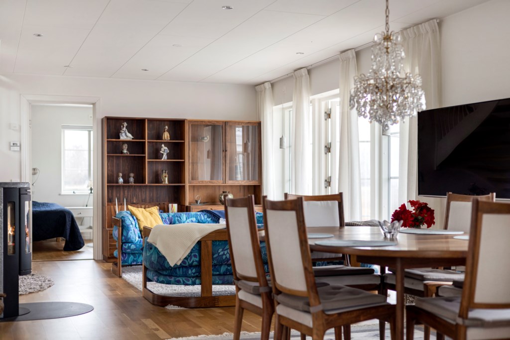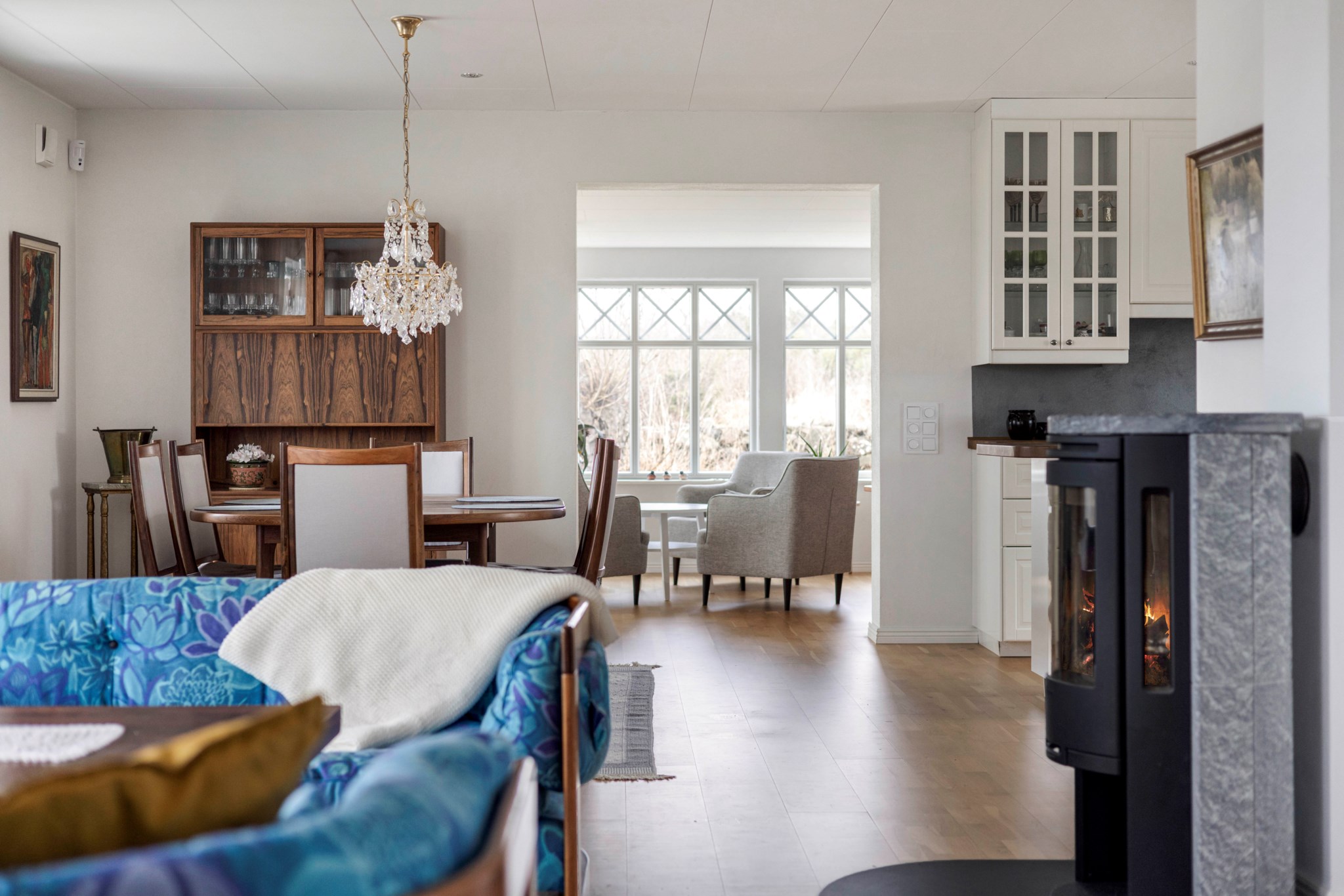 Redan i den välkomnande entrén möts du av en ljus och inbjudande hall med goda förvaringsmöjligheter och behaglig vattenburen golvvärme som löper över hela bottenplanet. Härifrån öppnar bostaden upp sig mot ett härligt allrum och kök i öppen planlösning. Det stora fönsterpartiet ger ett fantastiskt ljusinsläpp och skapar en fin kontakt med utemiljön, samtidigt som du når terrassen direkt från rummet. Den värmande kaminen blir en naturlig samlingspunkt och bidrar med både atmosfär och komfort. I anslutning till entrén finns ett rogivande sovrum samt ett välutrustat, helkaklat badrum i ljus interiör. Här finns även en praktisk tvättdel med tvättmaskin, torktumlare och torkskåp samt generösa förvaringslösningar som förenklar vardagen. Köket är smakfullt inrett i vitt med stilrena ekbänkskivor och rostfria vitvaror. Den centralt placerade köksön erbjuder både arbetsyta och social samvaro. Planlösningen är öppen mot allrummet, med gott om plats för såväl matbord som soffgrupp – en perfekt yta för både vardagsliv och festliga tillställningar. Vidare nås ett elegant sällskapsrum med plats för matsalsmöblemang och utgång till ett generöst uterum, även detta med golvvärme. Härifrån kliver du vidare ut till den stenbelagda uteplatsen – en skyddad och trivsam miljö för långa middagar och avkopplande stunder.