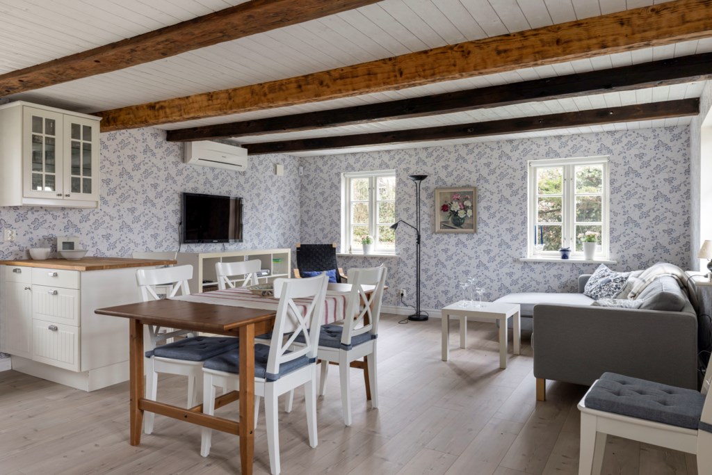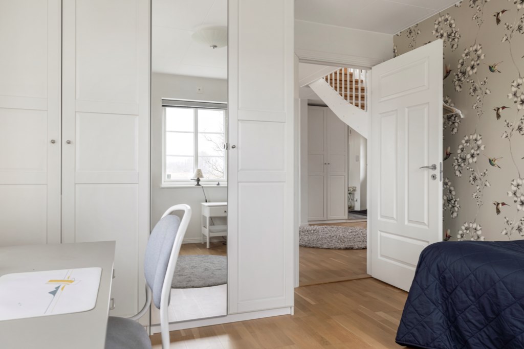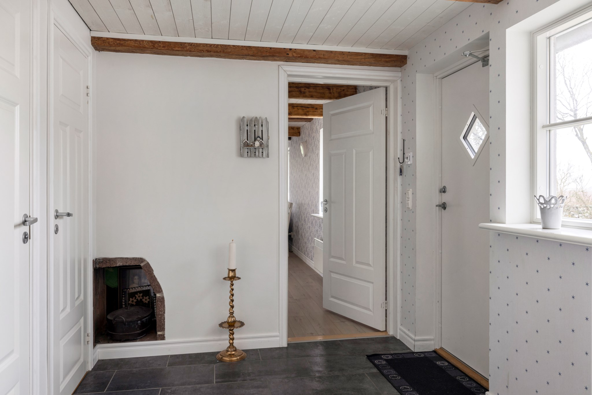 På fastigheten finns även ett charmigt gästhus som är praktiskt sammankopplat med huvudhuset, men som samtidigt har en egen ingång – perfekt för gäster, uthyrning eller generationsboende. Här möts du av en hall med golvvärme som fortsätter in i det helkaklade badrummet med dusch och tvättmöjligheter. I anslutning finns ett rymligt förråd som ger goda förvaringsytor. Gästhuset erbjuder kök och allrum i öppen planlösning med synliga bjälkar, järnspis och fina detaljer som skapar en varm och genuin känsla. På ovanvåningen finns två sovrum samt en möblerbar hall – en flexibel yta som kan användas som arbetsplats, lekhörna eller extra sällskapsyta.