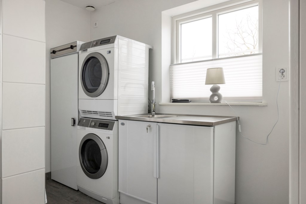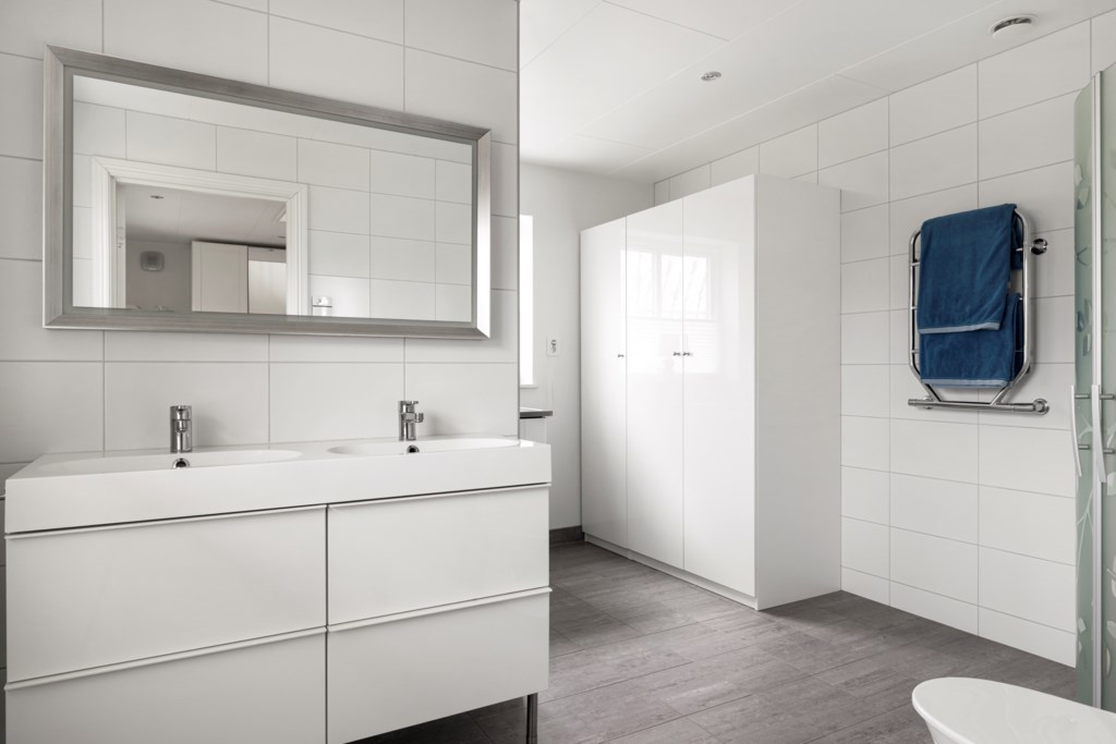 Helkaklat. Utrustning: Dusch, dubbla handfat, toalett, handdukstork, tvättmaskin, torktumlare, torkskåp