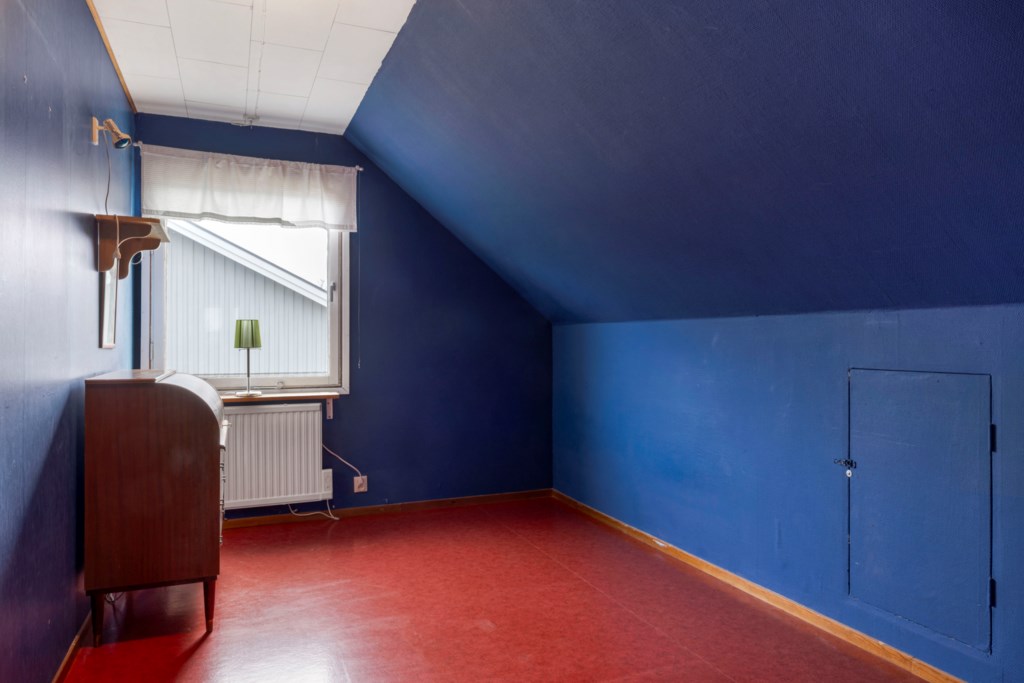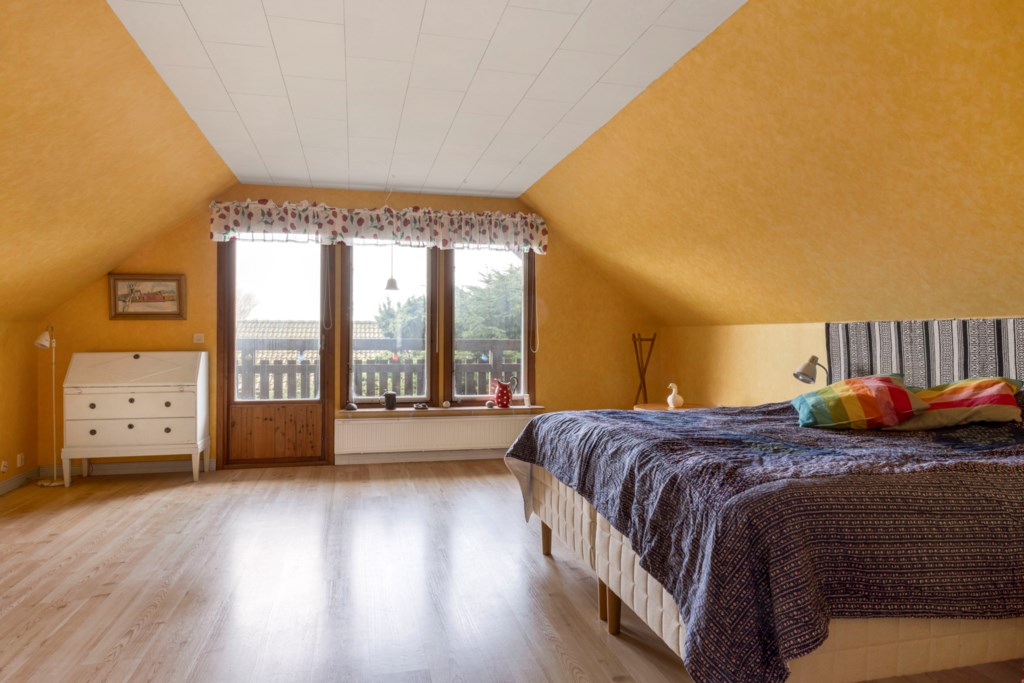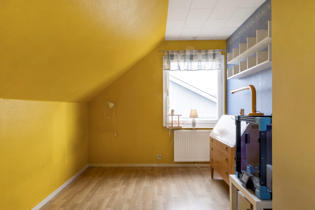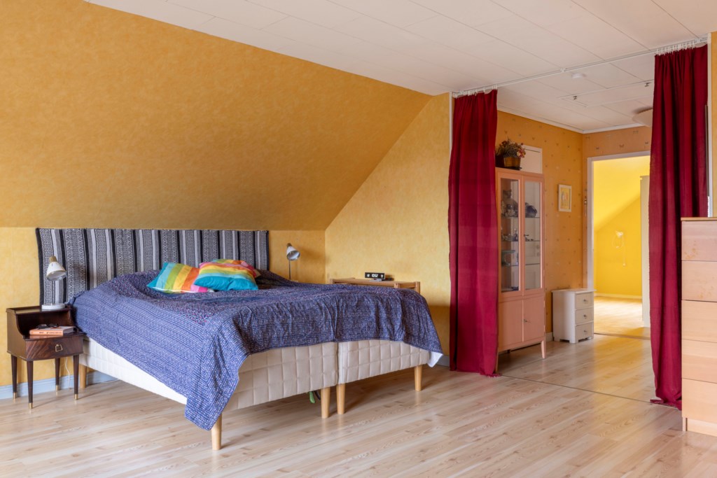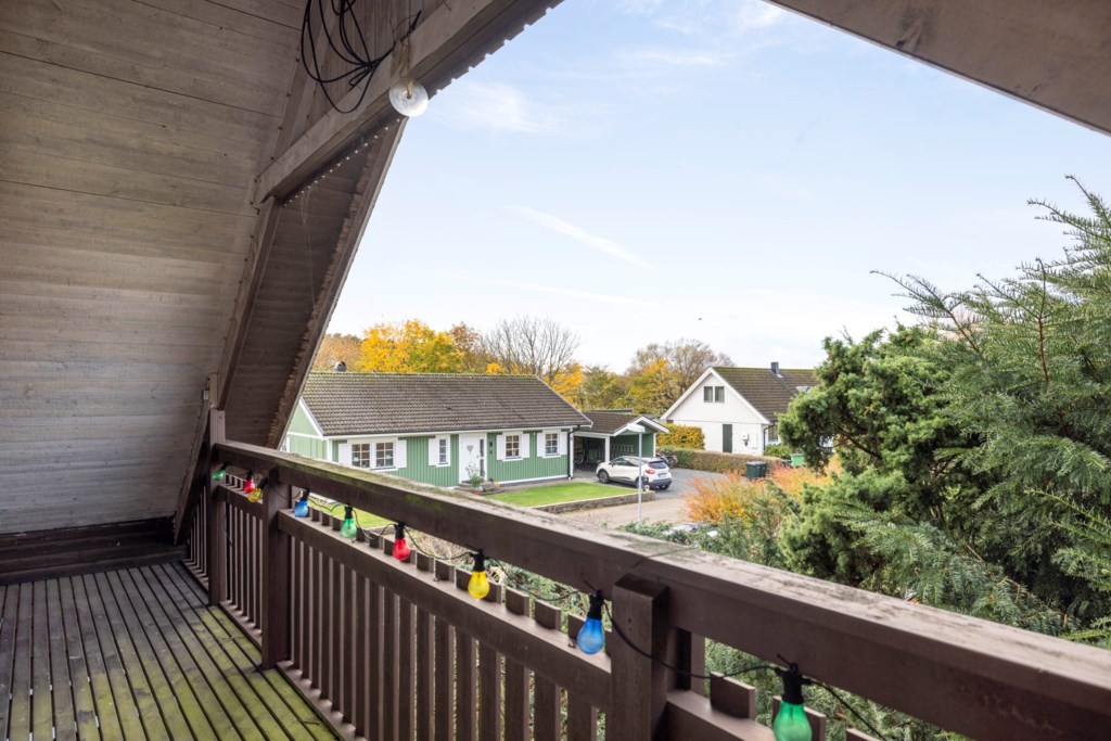 En trappa upp möts du av ett stort och ljust allrum med utgång till en joddlarbalkong i bästa västerläge – här kan du njuta av kvällssolen och vackra solnedgångar. Vidare finns två sovrum, en WC samt en rymlig klädkammare.Kök