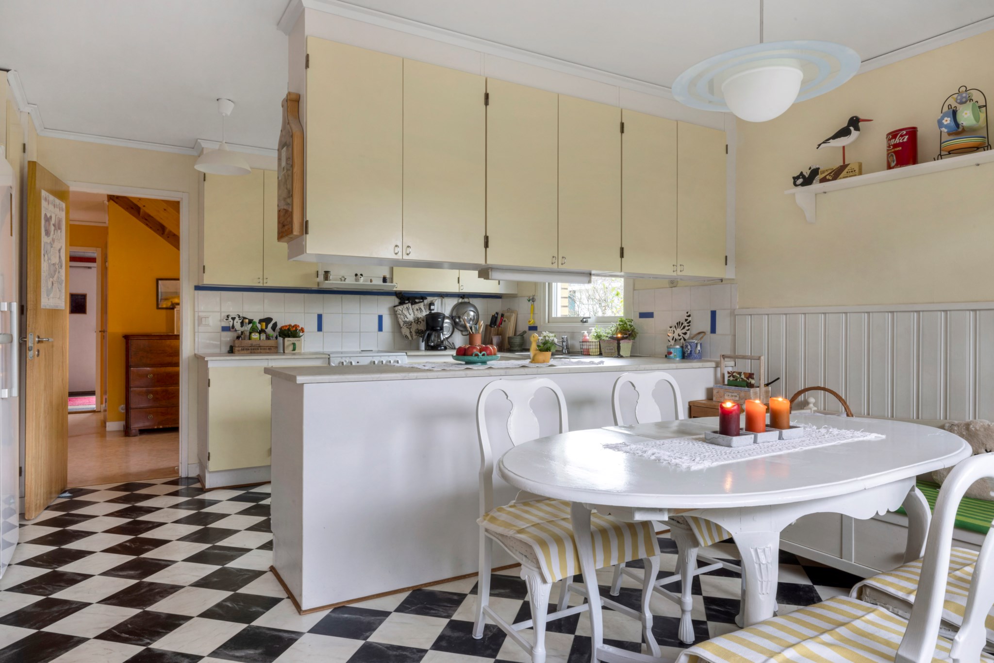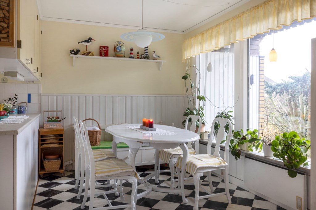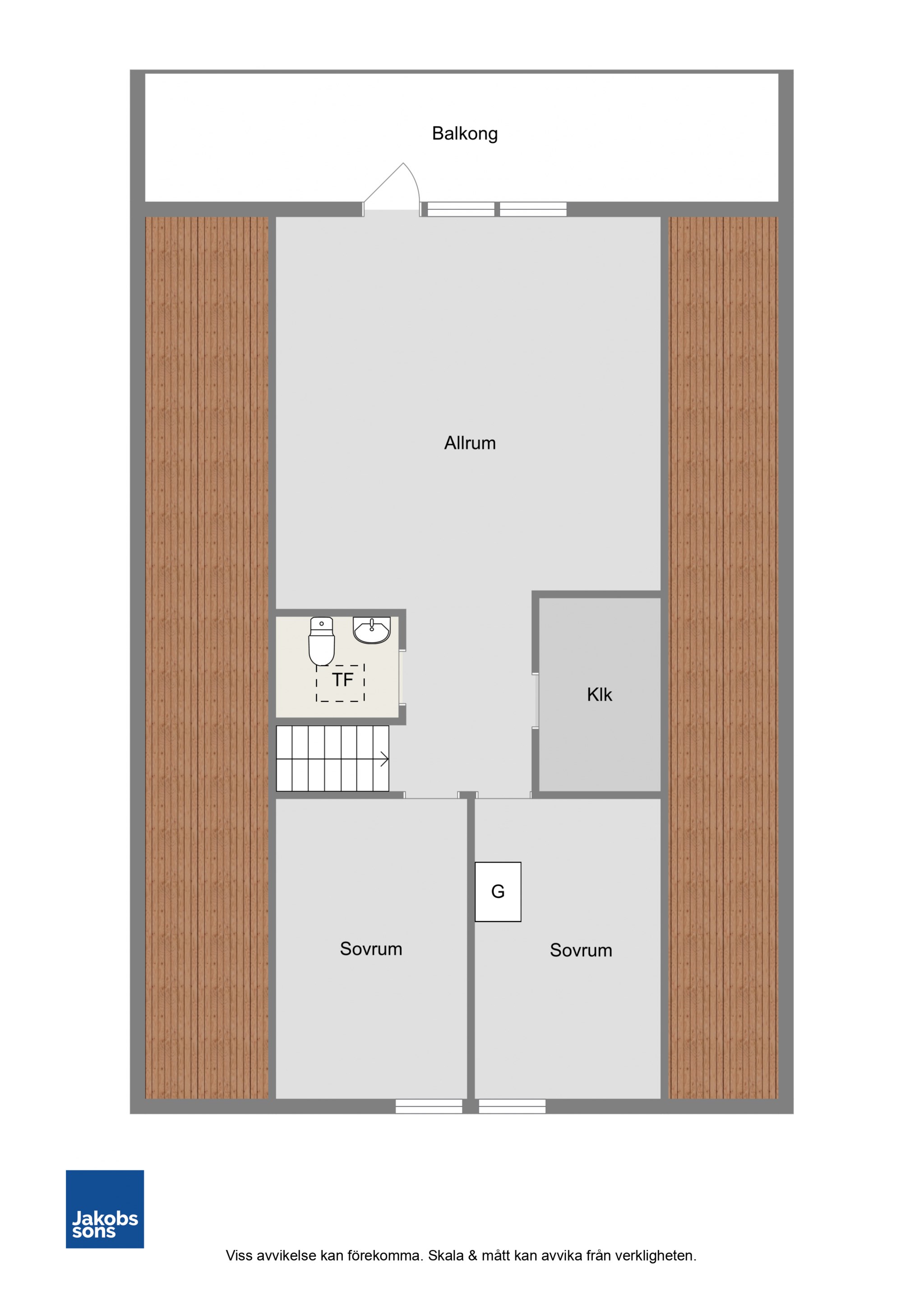 En trappa upp möts du av ett stort och ljust allrum med utgång till en joddlarbalkong i bästa västerläge – här kan du njuta av kvällssolen och vackra solnedgångar. Vidare finns två sovrum, en WC samt en rymlig klädkammare.Kök