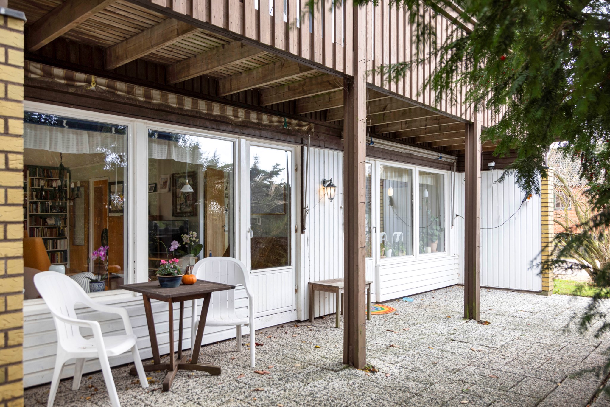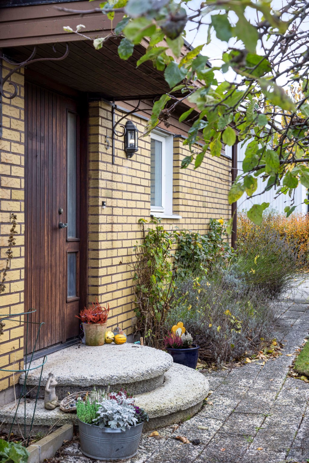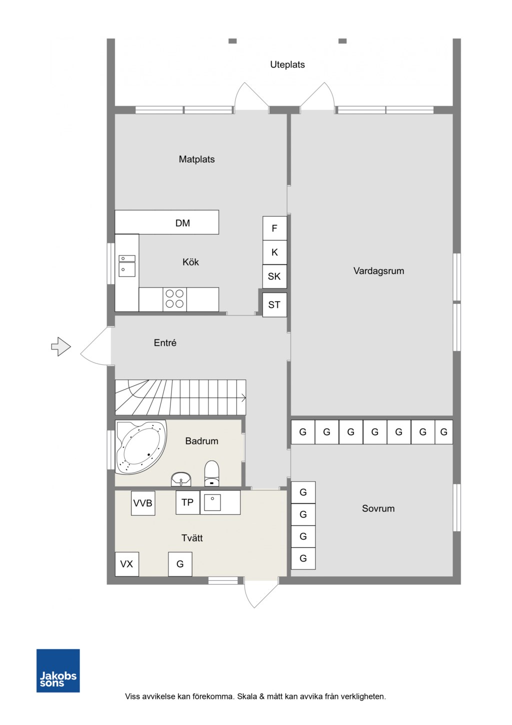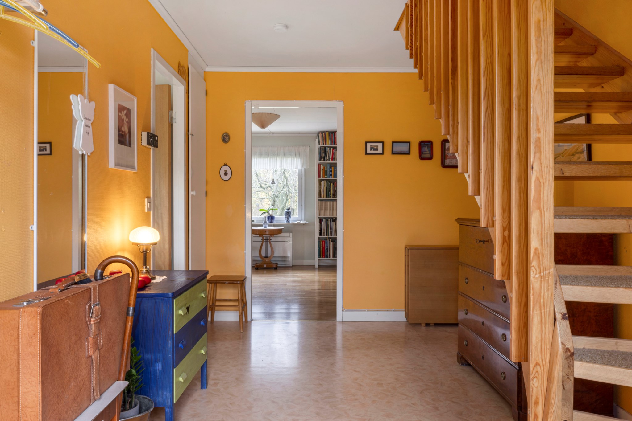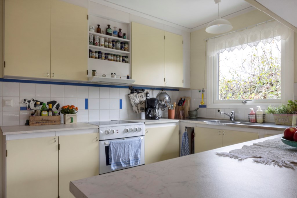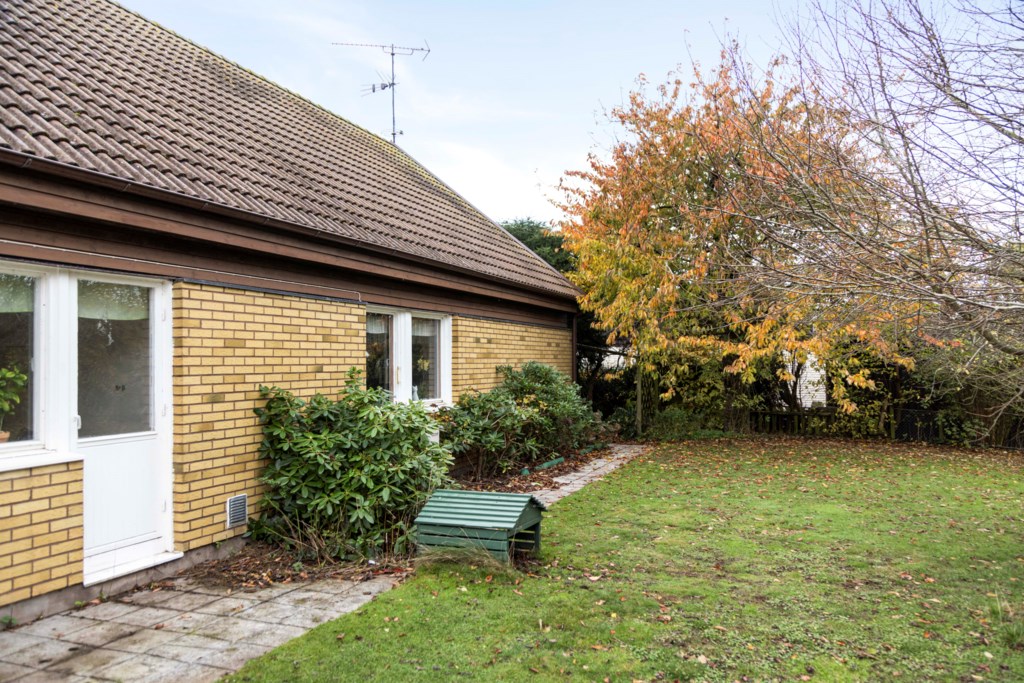 Välkomnande entré med plats för ytterkläder och skor. Härifrån nås bostadens generösa allrum som tillsammans med det rymliga köket skapar en trivsam och öppen känsla med gott om utrymme för både vardag och umgänge. Det finns utgång till en stenbelagd uteplats både från köket och allrummet – perfekt för sommarens måltider och avkoppling. På entréplanet finns dessutom ett sovrum med utgång till trädgården samt ett badrum utrustat med badkar. Praktisk groventré med tvättmaskin, torktumlare och tvättställ.