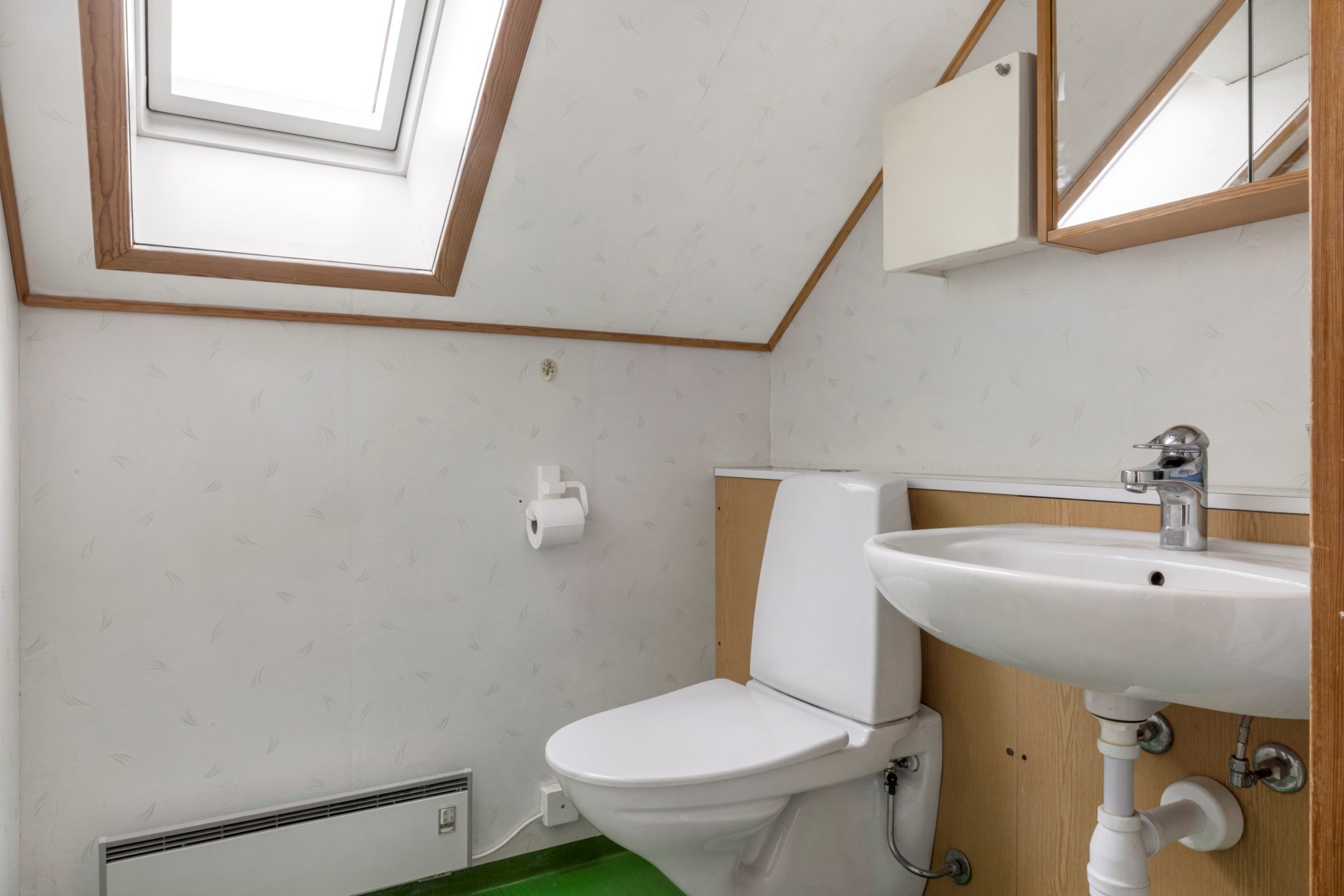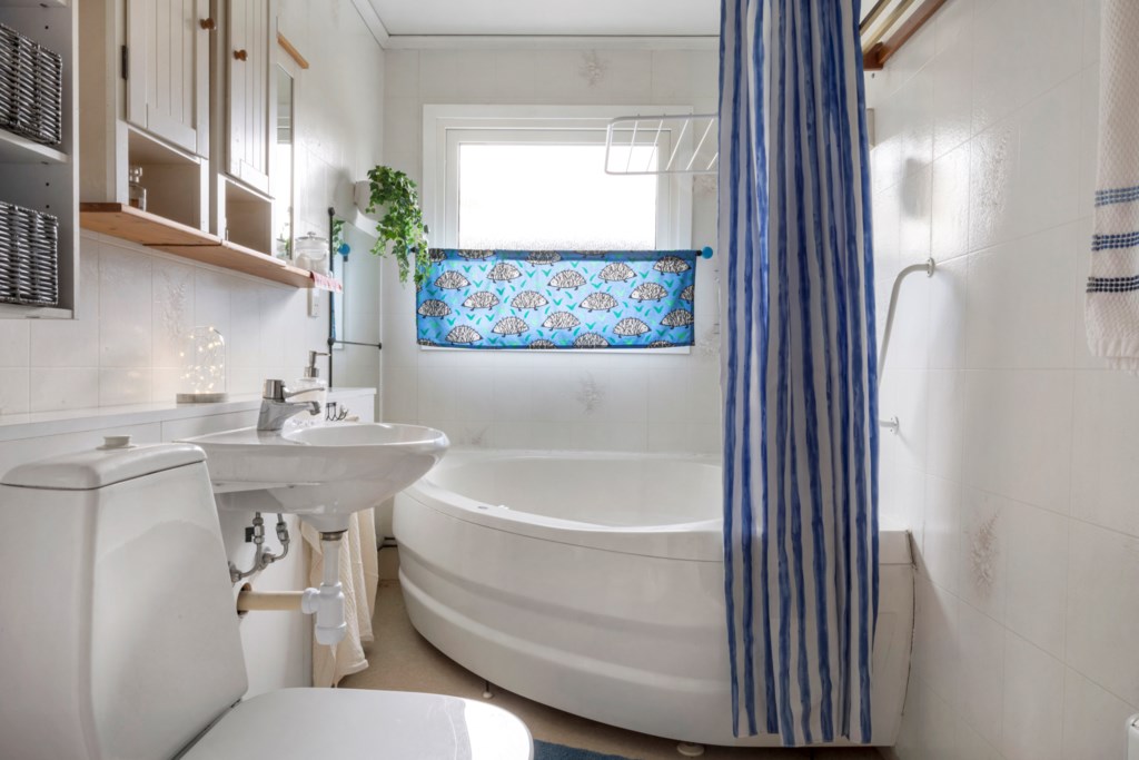 Våtrumstapet och plastmatta. Utrustning: Badkar, toalett och tvättställ.