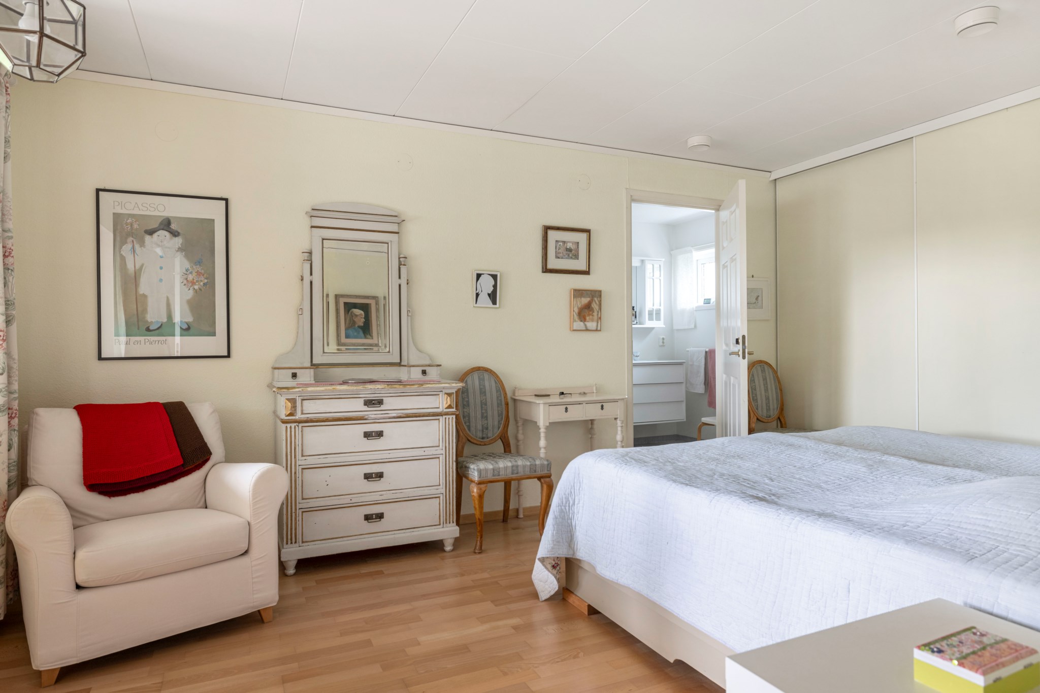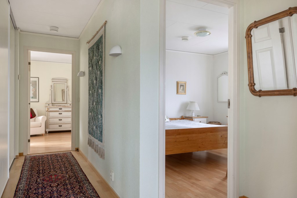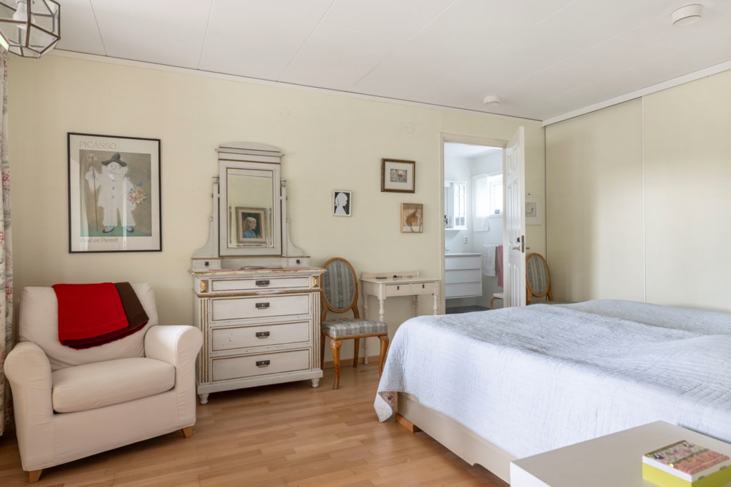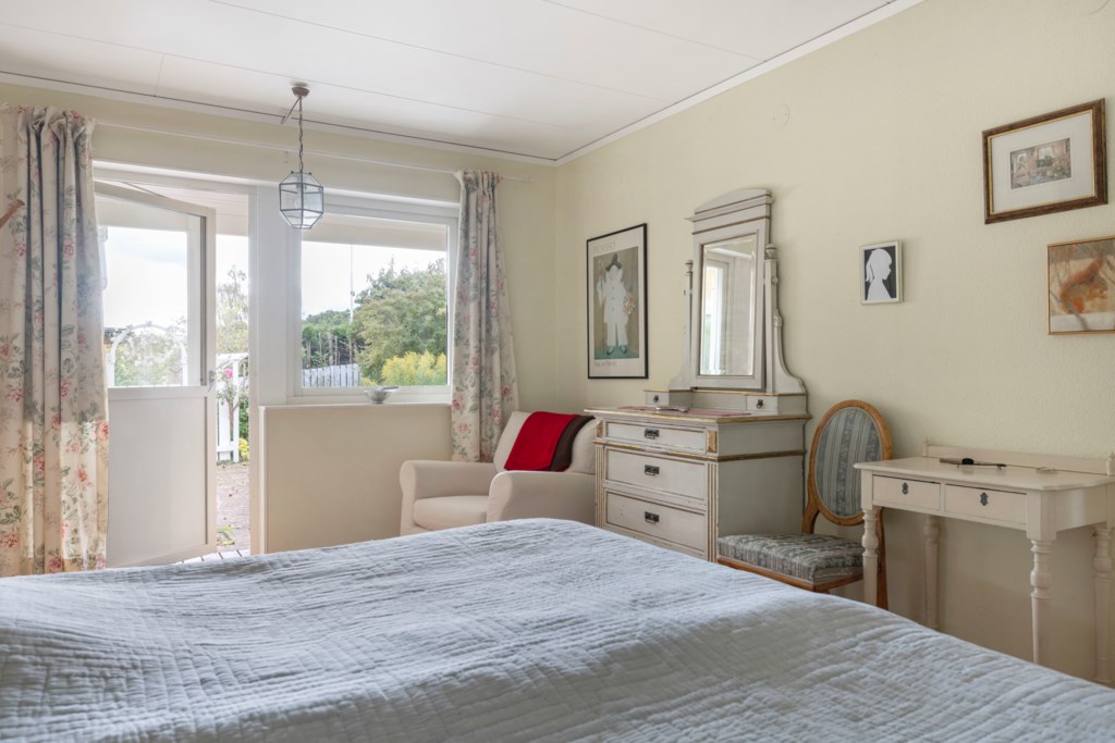 I den avskilda sovrumsdelen finns tre rymliga sovrum, varav ett med direkt utgång till uteplatsen. Här finns även två badrum, vilket ger god funktionalitet för både familj och gäster samt generöst med förvaringsmöjligheter.