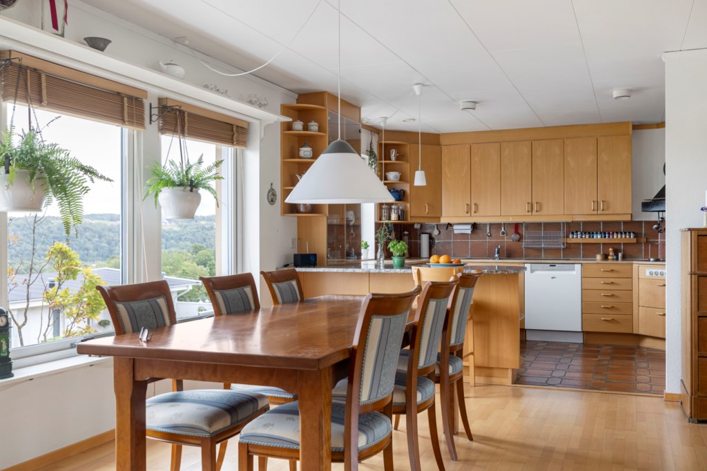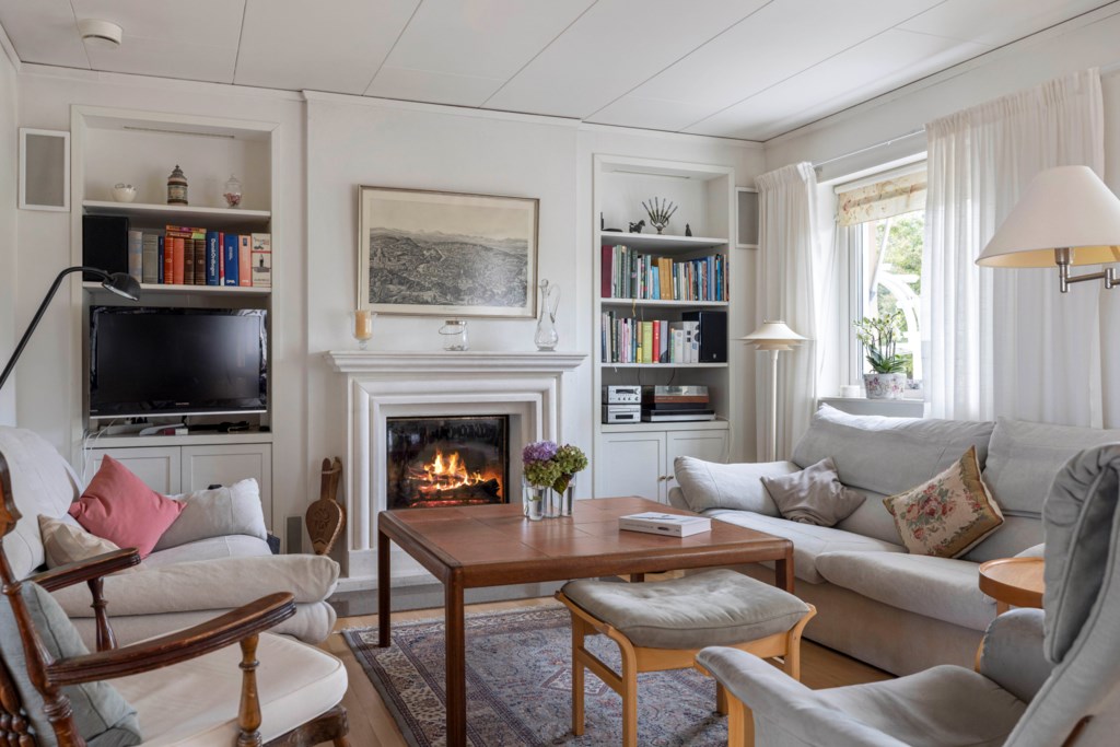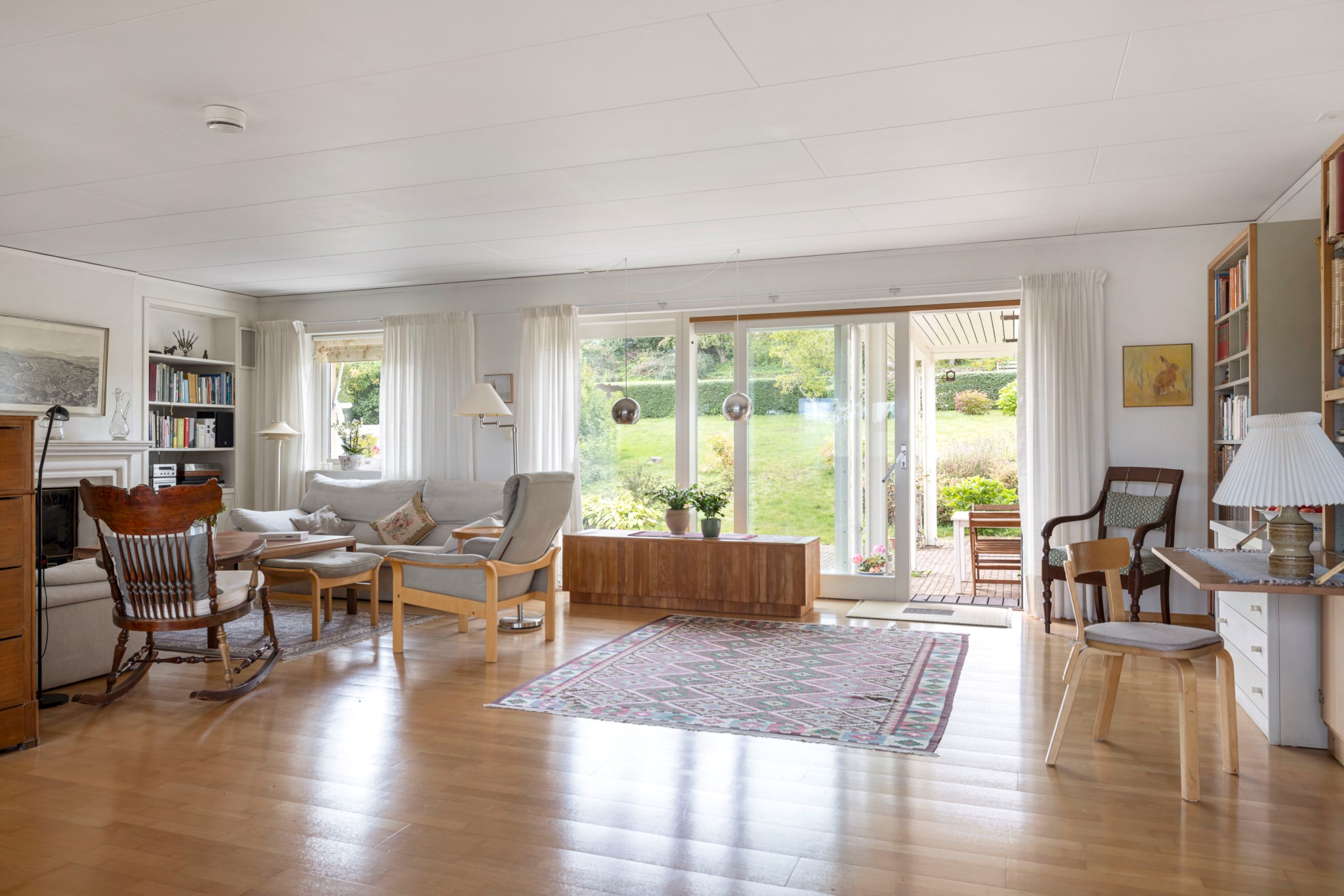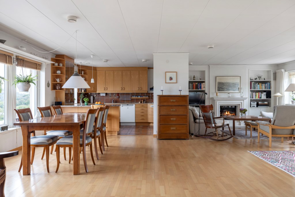 Husets övre plan erbjuder en generös och sammanhängande planlösning där köket ligger i öppen anslutning till allrummet. Denna utformning skapar en naturlig och inbjudande samvaroyta, med fint ljusinsläpp och vacker utsikt över havet och det omgivande landskapet. Här finns en öppen spis med insatskassett som ger både värme och trivsel under årets kallare månader. Från allrummet nås en stenbelagd och insynsskyddad uteplats, perfekt för avkoppling och umgänge i skyddat läge.