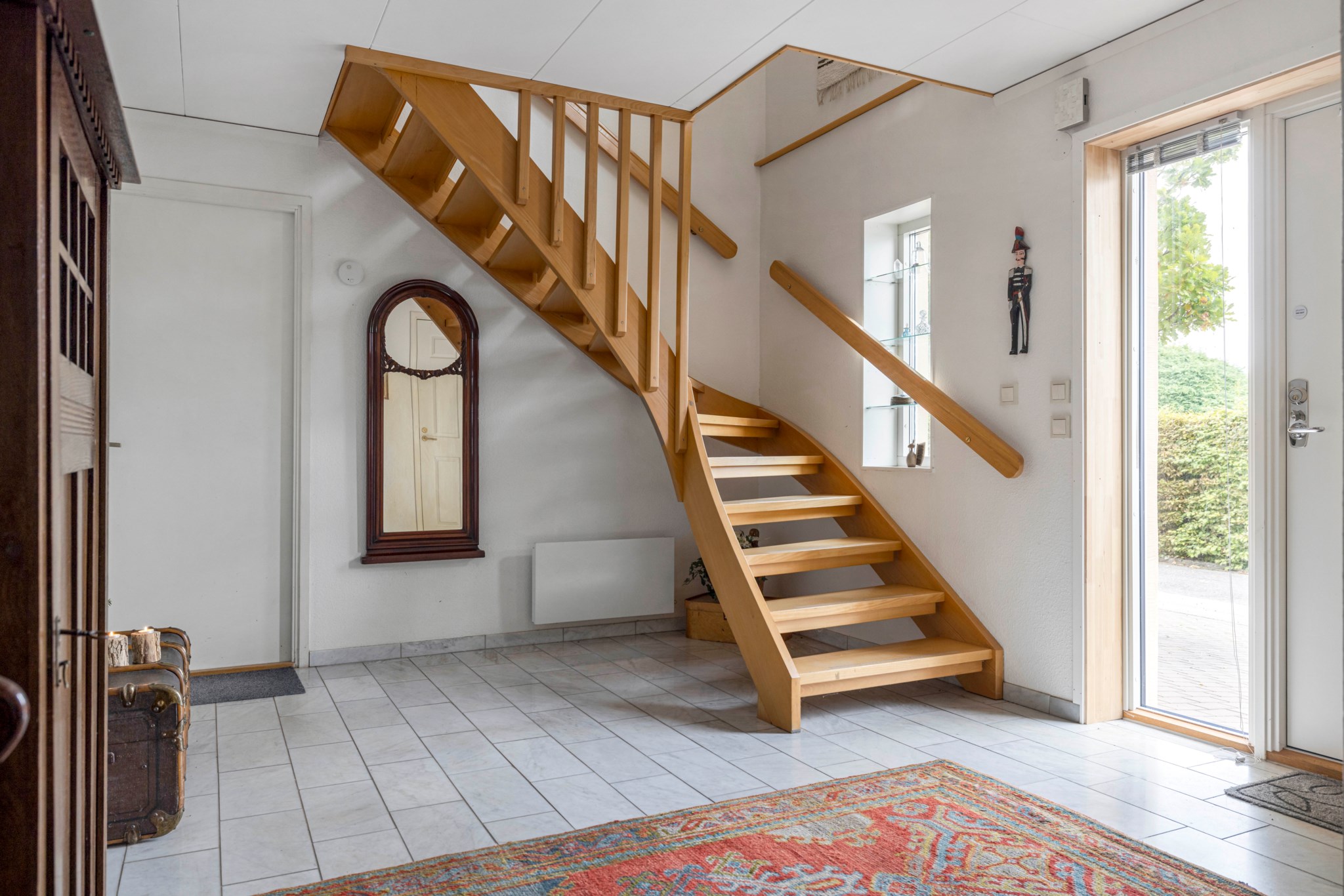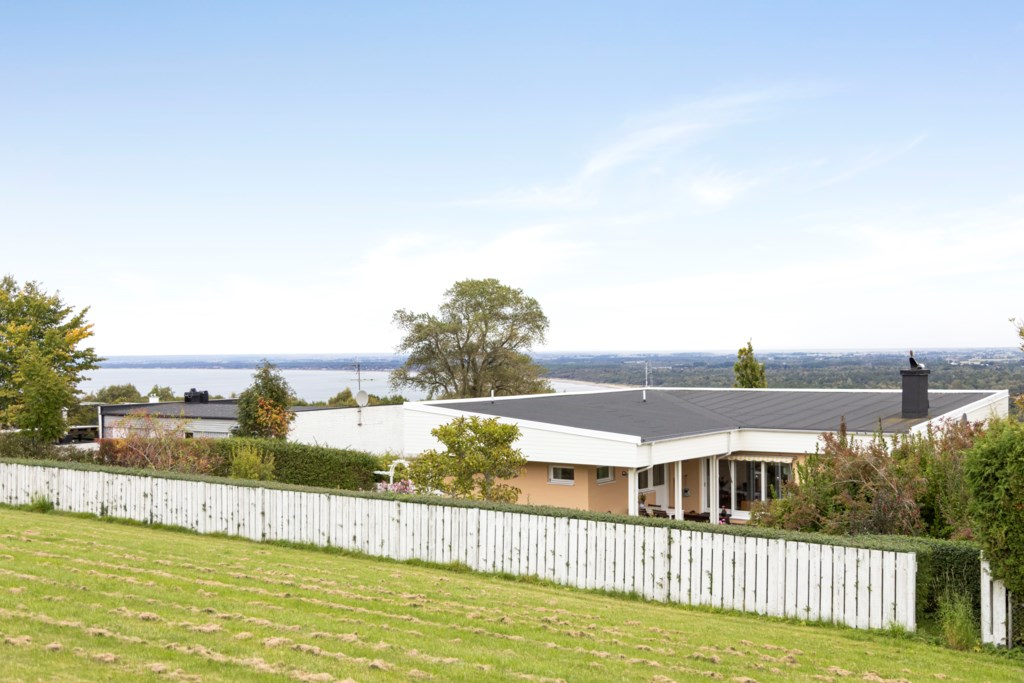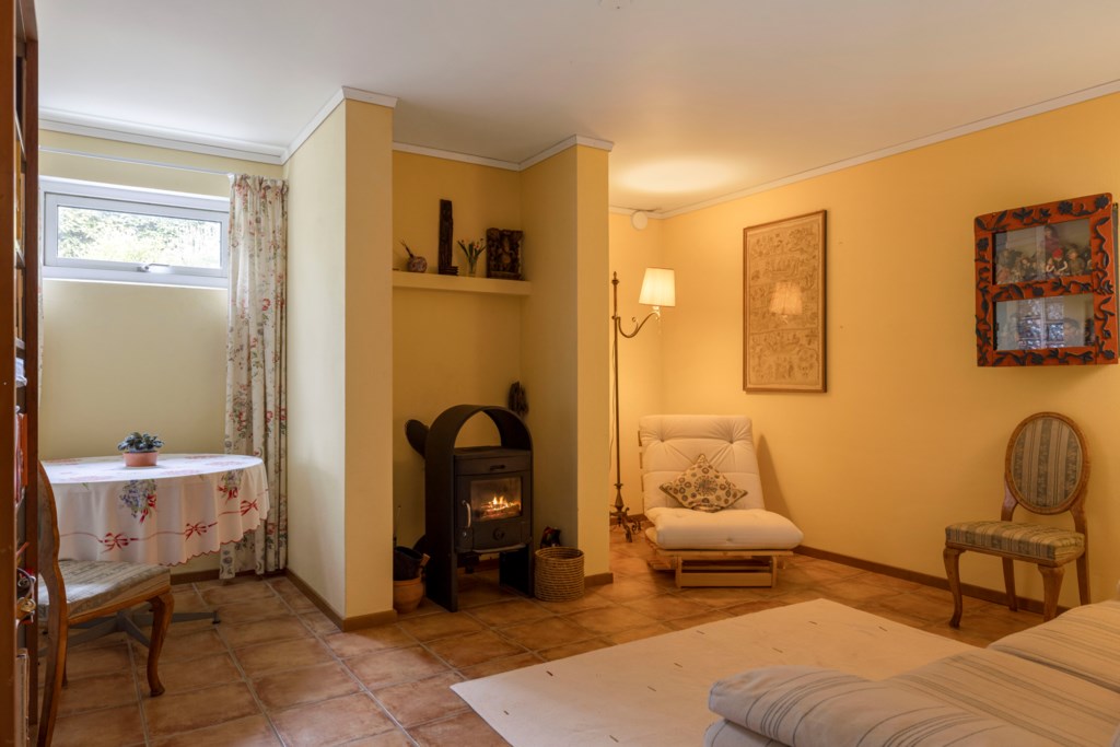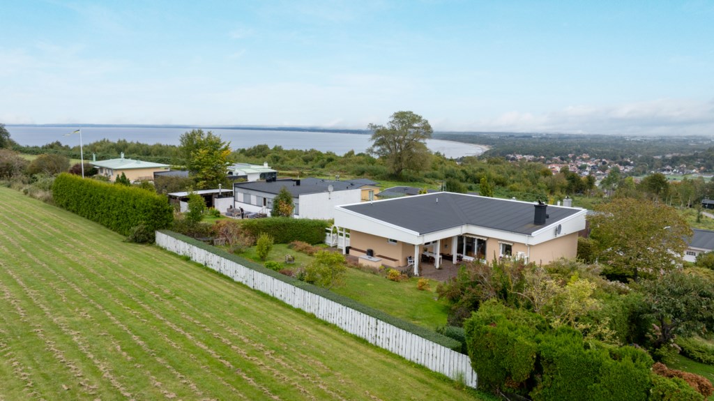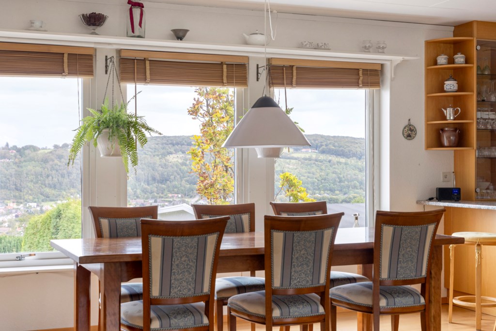 Husets övre plan erbjuder en generös och sammanhängande planlösning där köket ligger i öppen anslutning till allrummet. Denna utformning skapar en naturlig och inbjudande samvaroyta, med fint ljusinsläpp och vacker utsikt över havet och det omgivande landskapet. Här finns en öppen spis med insatskassett som ger både värme och trivsel under årets kallare månader. Från allrummet nås en stenbelagd och insynsskyddad uteplats, perfekt för avkoppling och umgänge i skyddat läge.