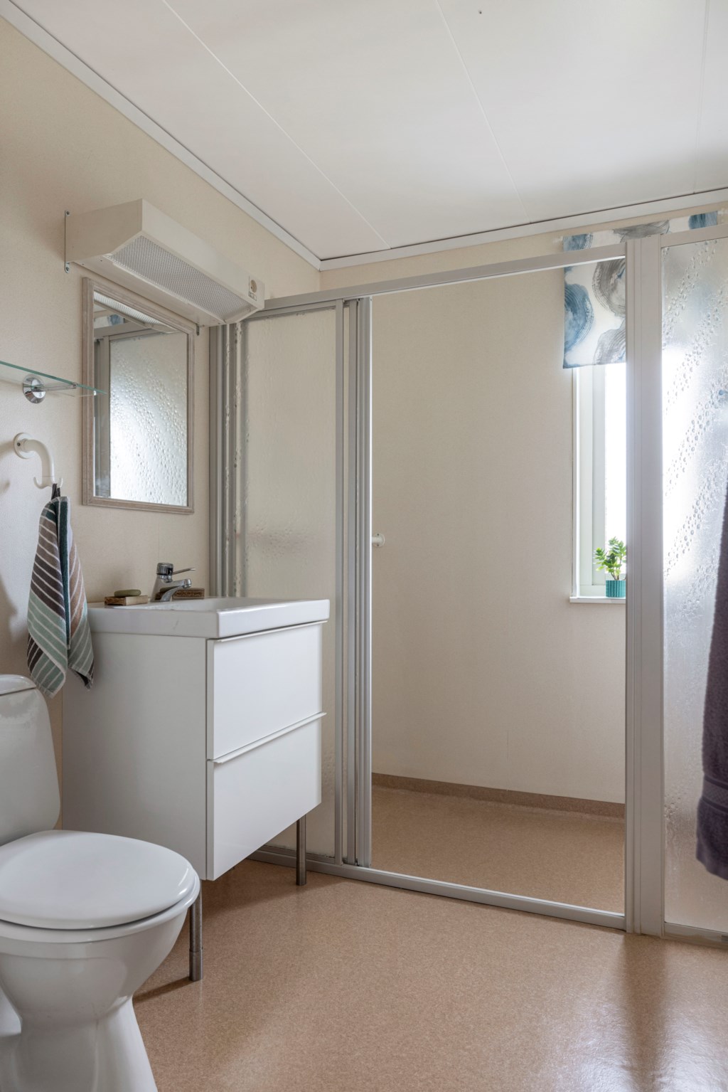 Våtrumstapet och plastmatta. Utrustning: Dusch, toalett och tvättställ.