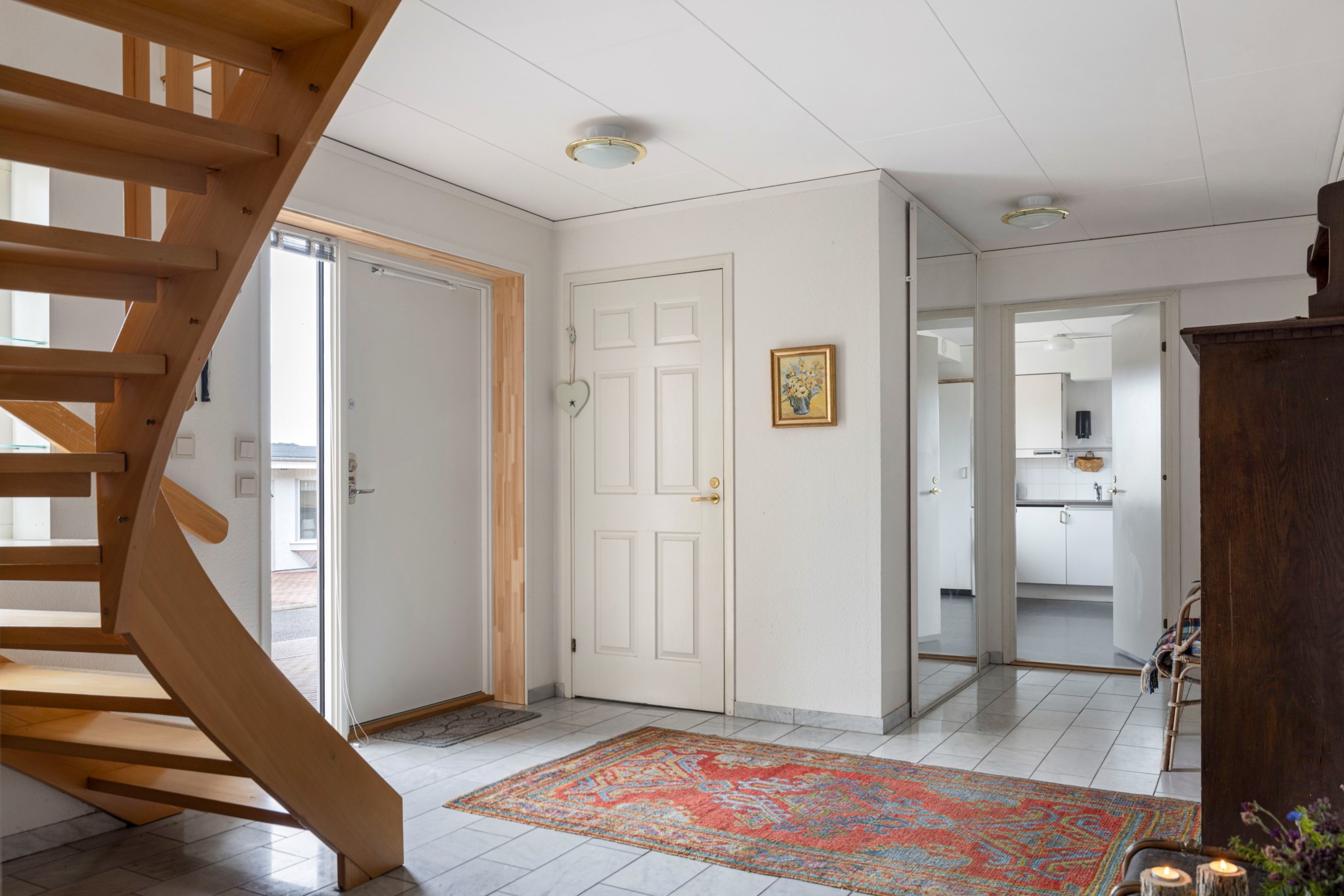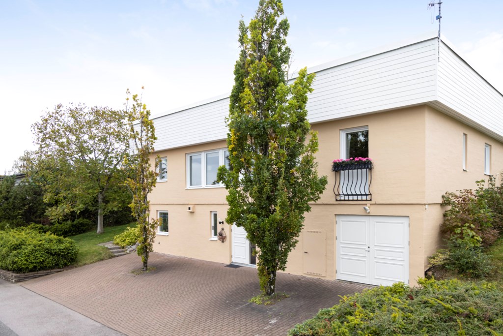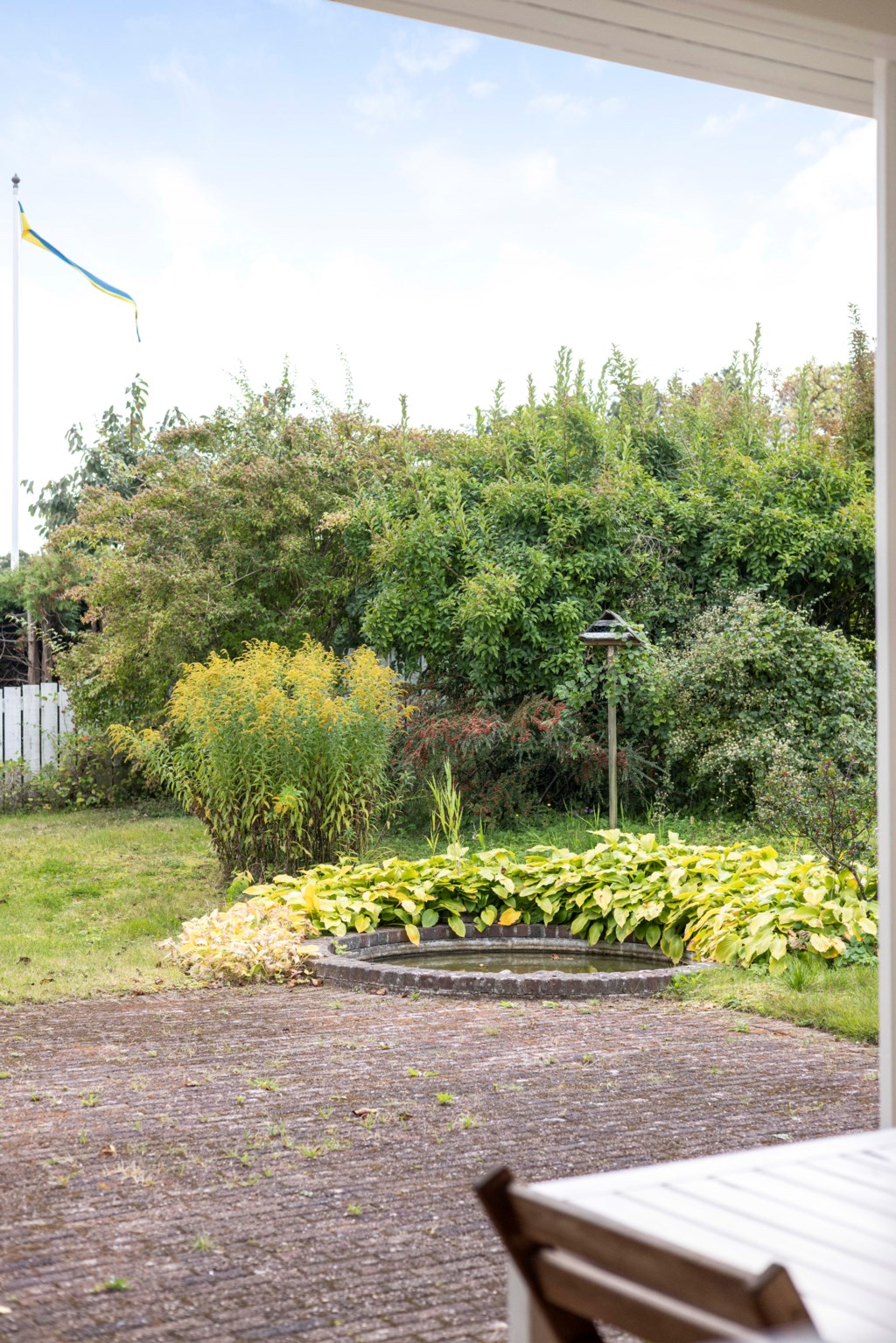 Trädgården är lättskött och välplanerad, med gott om utrymme för både avkoppling och lek. Tomten är insynsskyddad och ramas in av en häck, vilket ger en privat och rofylld atmosfär. Den stenbelagda uteplatsen, som nås direkt från allrummet, ligger i ett skyddat läge med fin kontakt mot trädgården.Uteplats