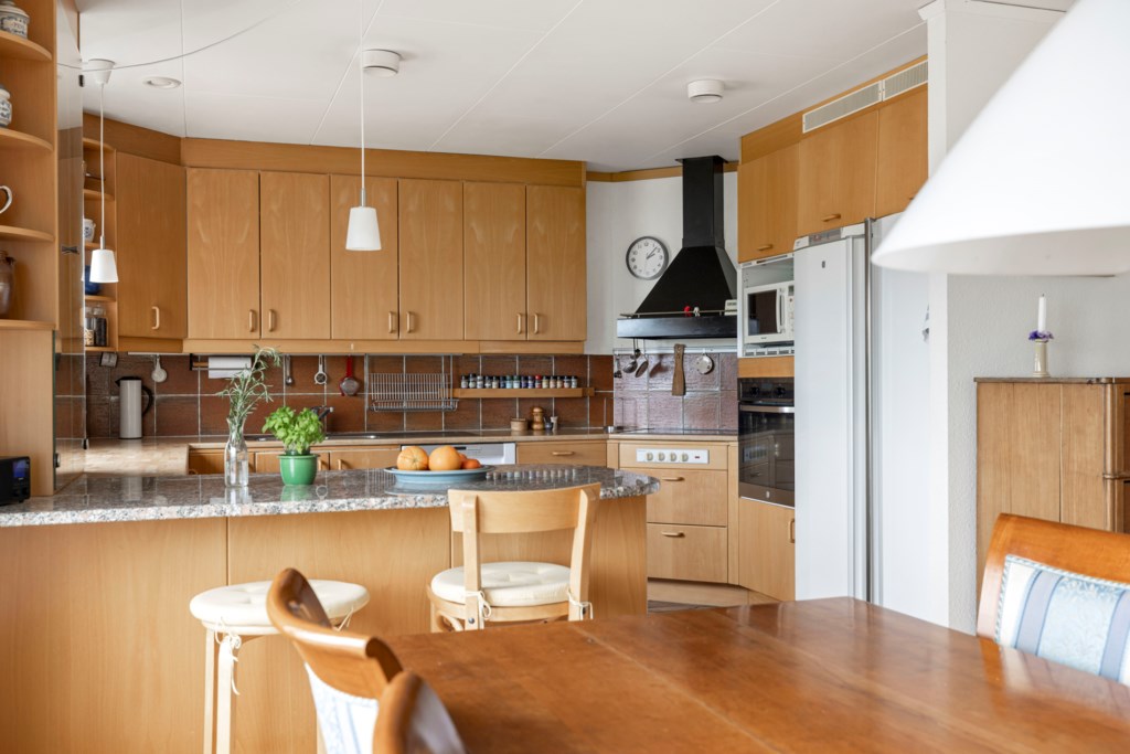 Utrustning: Spishäll, fläkt, inbyggnadsugn, diskmaskin, hel kyl och frys.