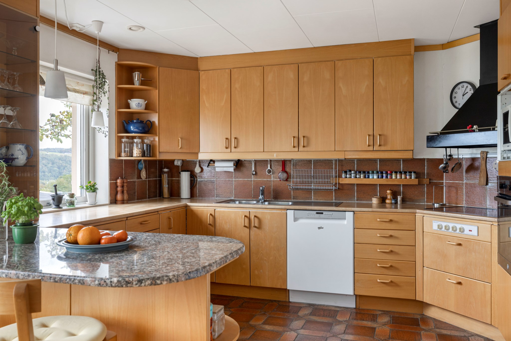 Suterrängplanet erbjuder en rymlig entré, separat WC, ett gästsovrum med kamin, stor tvättstuga, verkstad, vin-/matkällare samt direkt utgång till garage. Ett praktiskt och flexibelt plan med gott om utrymme för såväl vardagsliv som fritidsaktiviteter och förvaring.Kök