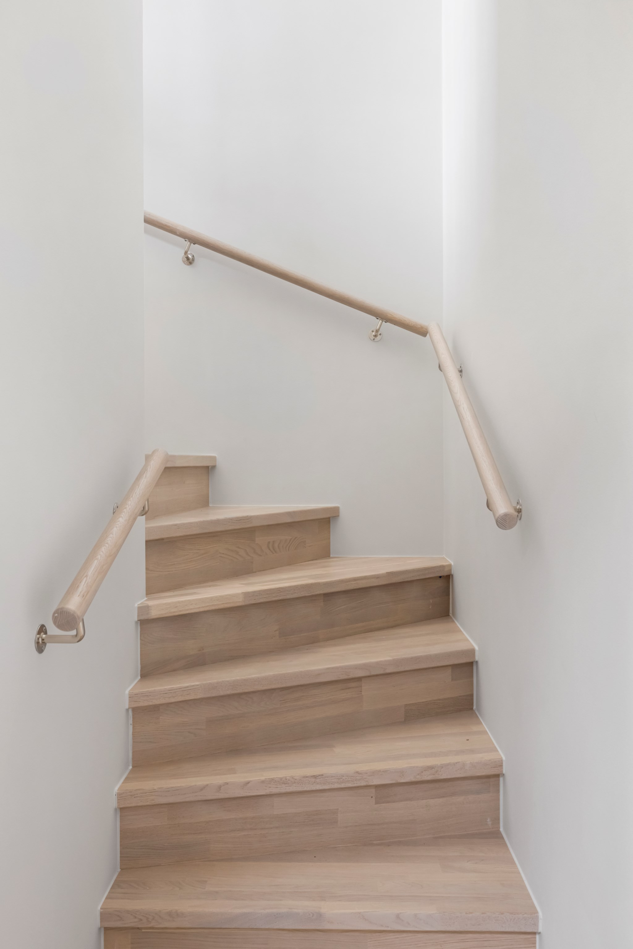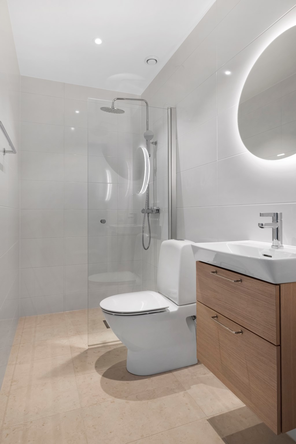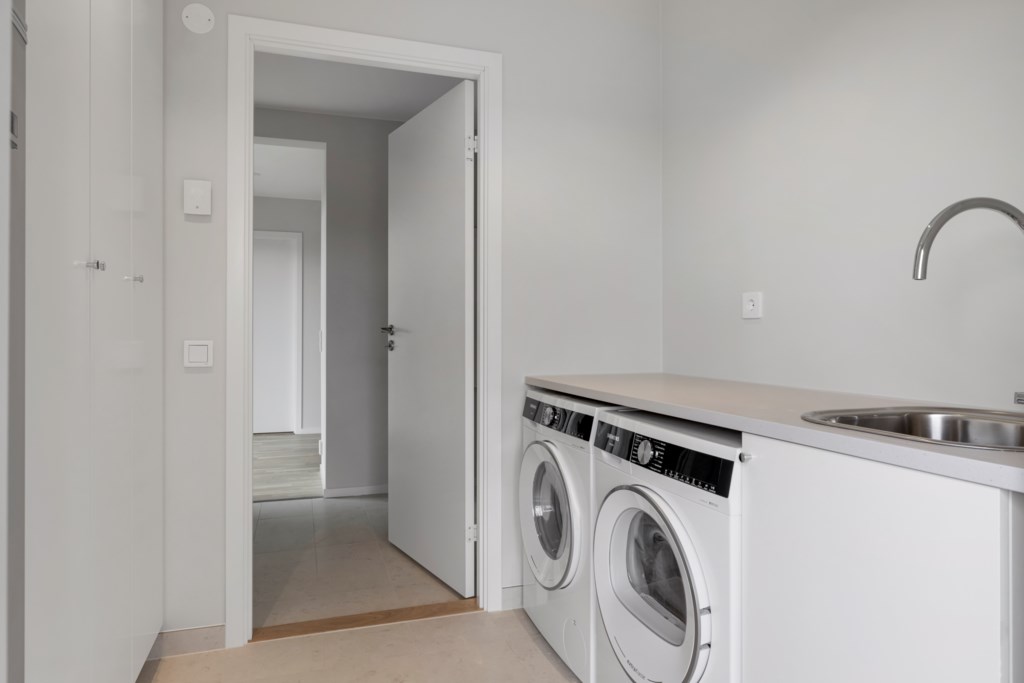 Husen har genomgående vattenburen golvvärme, vitpigmenterad ekparkett, stora fönsterpartier med fönsterbänk av kalksten och vitmålade väggar. Köksinredning från Ballingslöv, bänkskiva av stenkomposit och vitvaror från Siemens. Badrum med klinkergolv och kaklade väggar, inredning från Svedbergs, tvättmaskin och torktumlare från Siemens och blandare från Tapwell.